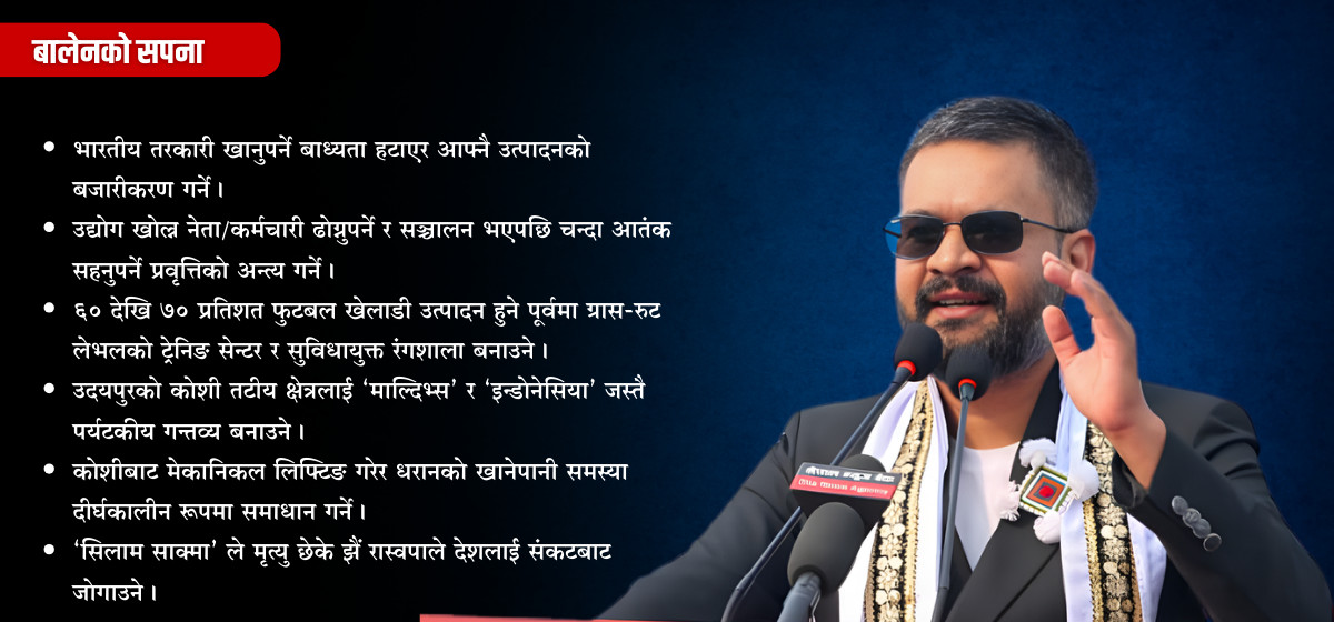 उनले किराती समुदायमा प्रचलित ‘सिलाम साक्मा’ को बिम्ब प्रयोग गरे। ‘जसरी सिलाम साक्माले मृत्युलाई छेक्छ र मान्छेलाई कालबाट जोगाउँछ, त्यसरी नै रास्वपा देशलाई संकटबाट जोगाउने ‘सिलाम साक्मा’ बन्न चाहन्छ,’ बालेनले हुँदै भने।
