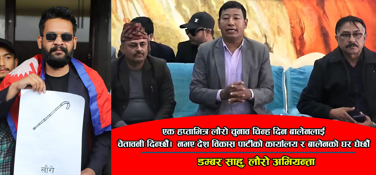 दुई थान केन्द्रीय सदस्यका लागि अनन्तराज घिमिरे र रोहन कार्कीलाई फकाइ बालेनले लौरो अपहरण गरेको उनले बताए। ‘एक हप्ताभित्र लौरो चुनाव चिन्ह दिन बालेनलाई चेतावनी दिन्छौँ। नभए देश विकास पार्टीको कार्यालय र बालेनको घरमा विरोध तथा धर्नाका कार्यक्रम गर्छौँ,’ साहुले भने।
