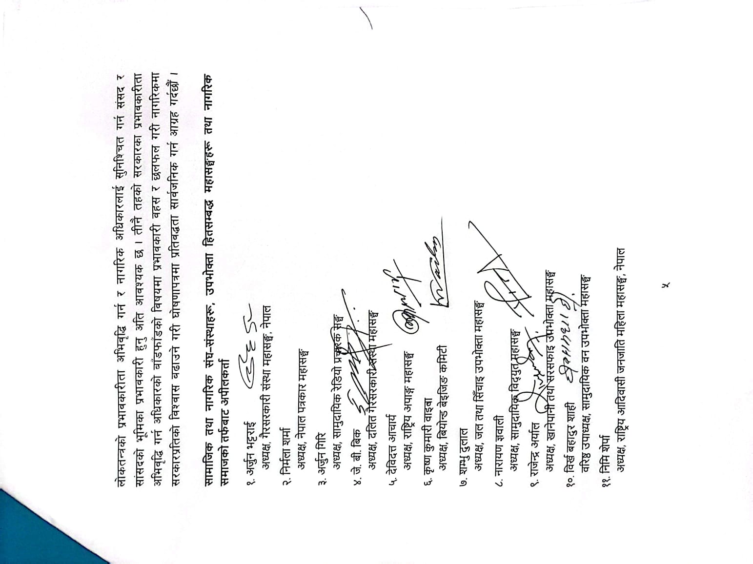 नागरिक समाजले घोषणापत्र केवल शासन प्रणालीको प्रतिबद्धता नभई नागरिक स्वतन्त्रता, समानता र न्याय सुनिश्चित गर्ने प्रतिवद्धता जनाउन माग गरेको छ । यो मागले नेपालको लोकतान्त्रिक स्थायित्व र दीर्घकालीन विकास सुनिश्चित गर्न सघाउ पुर्याउने विश्वास लिएको गैसस महासंघका अध्यक्ष भट्टराईले बताए ।