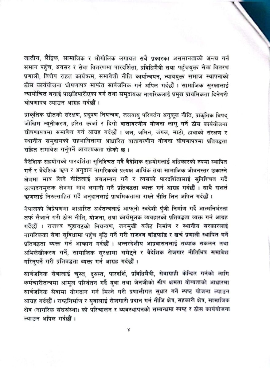 त्यस्तै, निर्वाचन खर्च पारदर्शिता, सार्वजनिक सेवा सुधार, बालबालिका, महिला, युवा, अपांगता भएका व्यक्ति र विभिन्न अल्पसंख्यकको अधिकार संरक्षण, शिक्षा, स्वास्थ्य, रोजगारी सिर्जना, वातावरणीय सुरक्षा र आत्मनिर्भर अर्थतन्त्र निर्माणमा राजनीतिक दलहरूले कार्यन्वयनयोग्य योजना समावेश गर्नुपर्ने अपिलमा जोड छ।