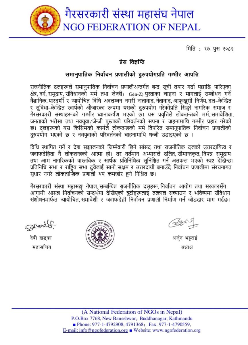 गैरसरकारी संस्था महासङ्घ नेपालले विज्ञप्ति जारी गर्दै राजनीतिक दलहरूले जेन्जी पुस्ताका चाहना, माग र परिवर्तनको आकांक्षालाई सम्बोधन गर्ने वैज्ञानिक, पारदर्शी र न्यायोचित विधि अवलम्बन नगरी समानुपातिक निर्वाचन प्रणालीलाई सुविधा–केन्द्रित निर्णय र आफूखुसी चयनको औजारका रूपमा प्रयोग गरेको उल्लेख गरेको छ । महासंघ अध्यक्ष अर्जुन भट्टराई र महासचिव देवी खड्काले हस्ताक्षर गरेको विज्ञप्तिमा यस्ता प्रवृत्तिले लोकतन्त्रको मर्म, समावेशिता र जनताको भरोसामाथि गम्भीर प्रहार गरेको उल्लेख गरिएको छ ।