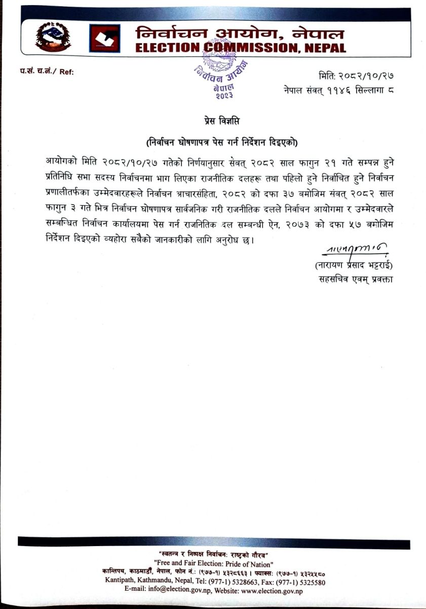 आगामी फागुन २१ गते हुने प्रतिनिधिसभा सदस्य निर्वाचनमा भाग लिएका राजनीतिक दलहरू तथा पहिलो हुने निर्वाचित हुने निर्वाचन प्रणालीतर्फका उम्मेदवारहरूले निर्वाचन आचारसंहिता, २०८२ को दफा ३७ बमोजिम फागुन ३ गतेभित्र घोषणापत्र बुझाउनुपर्ने आयोगका प्रवक्ता नारायणप्रसाद भट्टराईले जारी गरेको विज्ञप्तिमा उल्लेख छ।