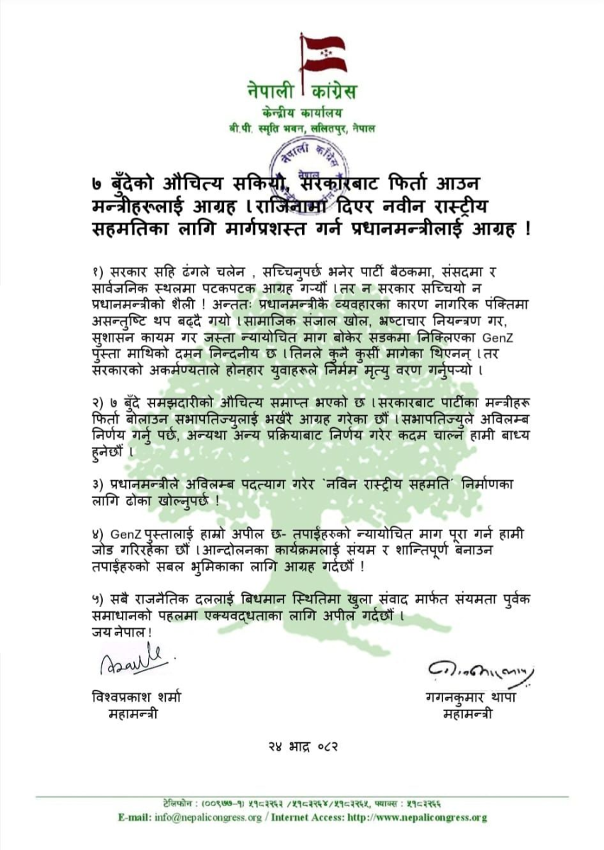 नेपाली काँग्रेसका महामन्त्री गगन थापा र विश्वप्रकाश शर्माले सात बुँदेको औचित्य सकिएको भन्दै पार्टीलाई सरकारबाट बाहिरिन आग्रह गरेको छ। सरकार सही ढङ्गले नचलेको भन्दै ‘नवीन राष्ट्रिय सहमति’ निर्माण गर्ने मार्ग प्रशस्त गर्न प्रधानमन्त्रीलाई अपिल गरेको छ।