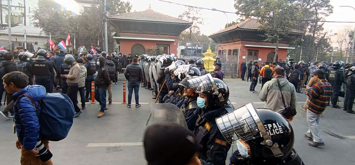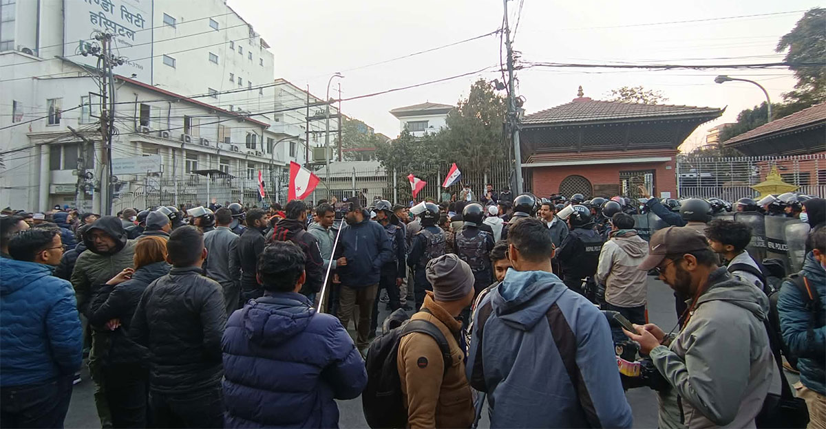 यी दृश्य निर्वाचन आयोग परिसर अगाडिको हो । जहाँ नेपाली कांग्रेसका दुई समूह आधिकारिकताको विषयमा छलफल गर्न निर्वाचन आयोग पुग्दा दुवैले नाराबाजी गरिरहेका छन् ।