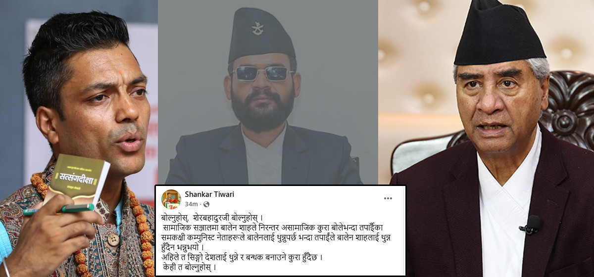‘बोल्नुहोस्, शेरबहादुरजी बोल्नुहोस्,’ तिवारीले लेखेका छन्, ‘सामाजिक सञ्जालमा बालेन साहले निरन्तर असामाजिक कुरा बोलेभन्दा तपाईँका समकक्षी कम्युनिस्ट नेताहरूले बालेनलाई थुन्नुपर्छ भन्दा तपाईँले बालेन शाहलाई थुन्न हुँदैन भन्नुभयो। अहिले त सिंगो देशलाई थुन्ने र बन्धक बनाउने कुरा हुँदै छ। केही त बोल्नुहोस्।’
