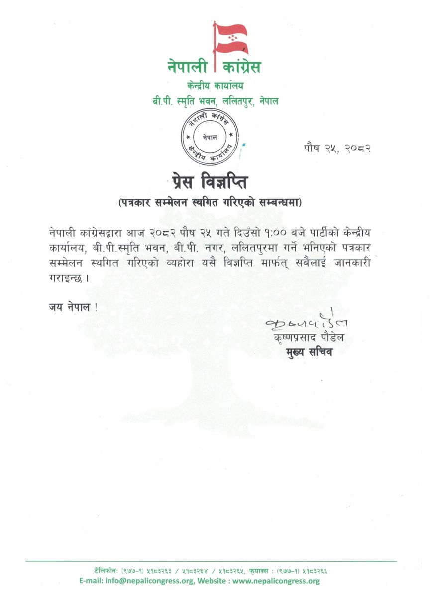 पार्टीका मुख्य सचिव कृष्णप्रसाद पौडेलद्वारा जारी प्रेस विज्ञप्तिमा भनिएको छ, ‘नेपाली कांग्रेसद्वारा आज २०८२ पौष २५ गते दिउँसो १:०० बजे पार्टीको केन्द्रीय कार्यालयमा गर्ने भनिएको पत्रकार सम्मेलन स्थगित गरिएको व्यहोरा यसै विज्ञप्तिमार्फत् सबैलाई जानकारी गराइन्छ।’
