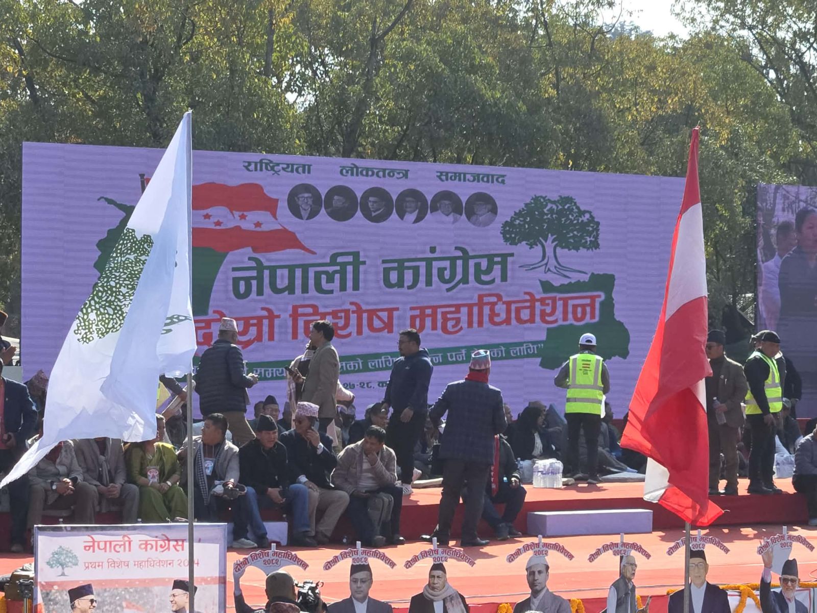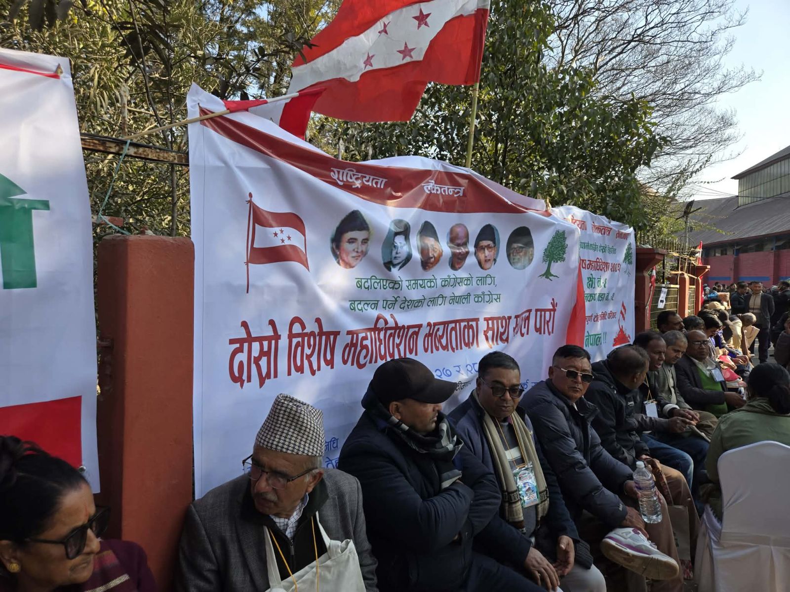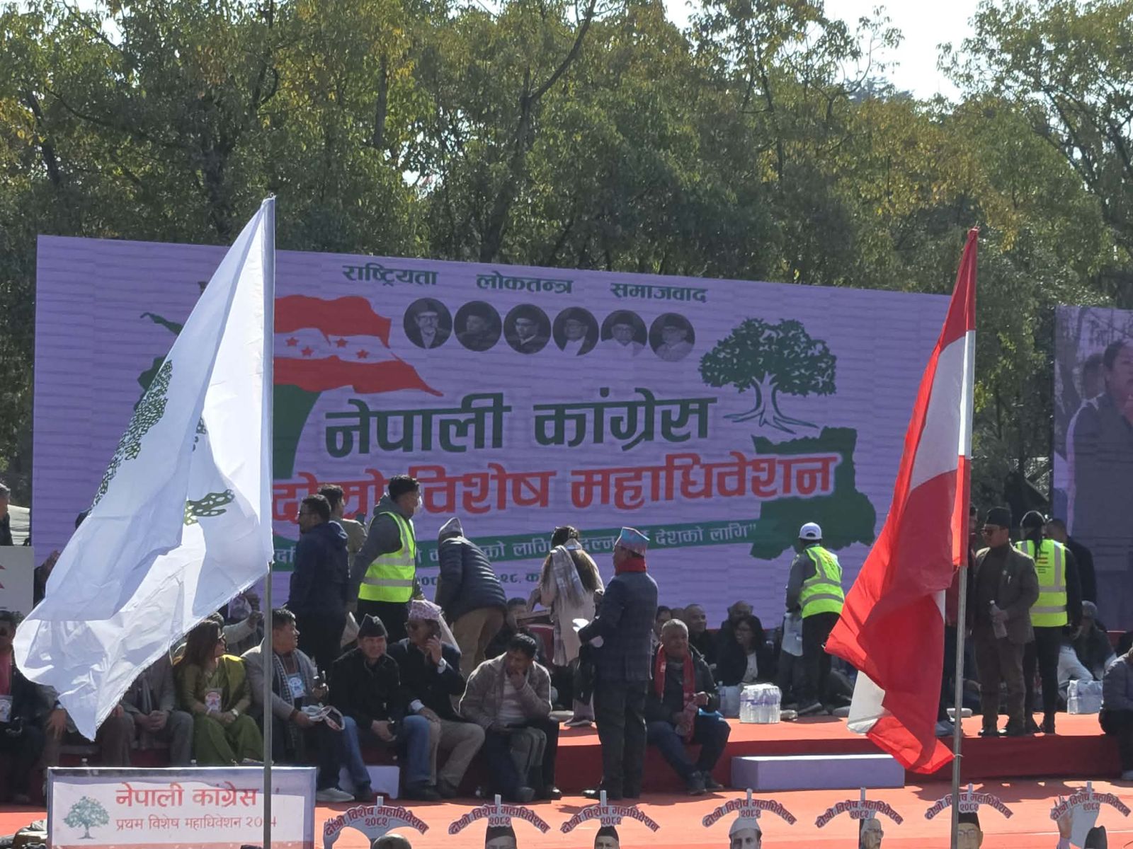 काठमाडौंको भृकुटीमण्डपमा जारी नेपाली कांग्रेसको विशेष महाधिवेशनको उद्घाटन सत्रमा संस्थापन (देउवा) पक्षका नेताहरूको समेत बाक्लो उपस्थिति देखिएको छ।
