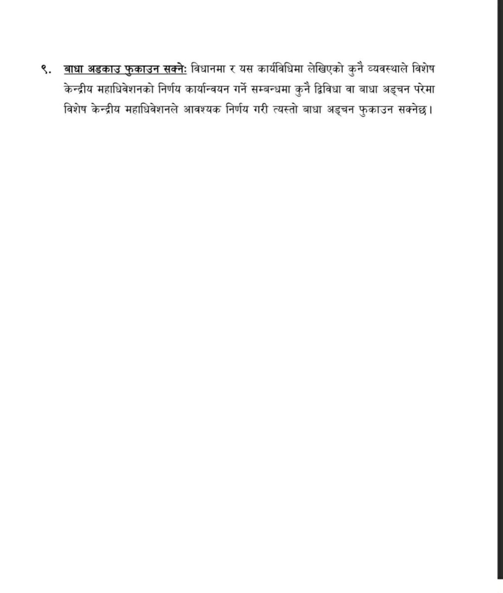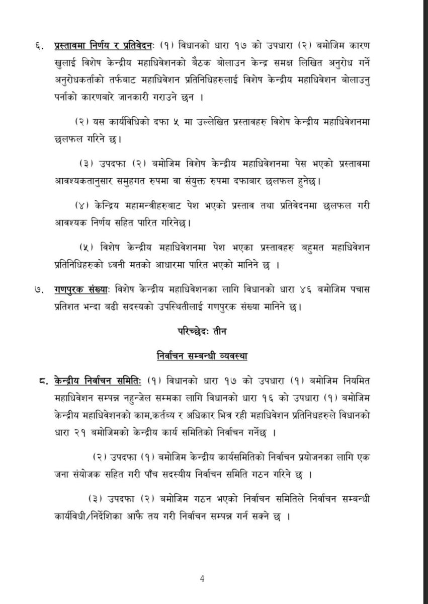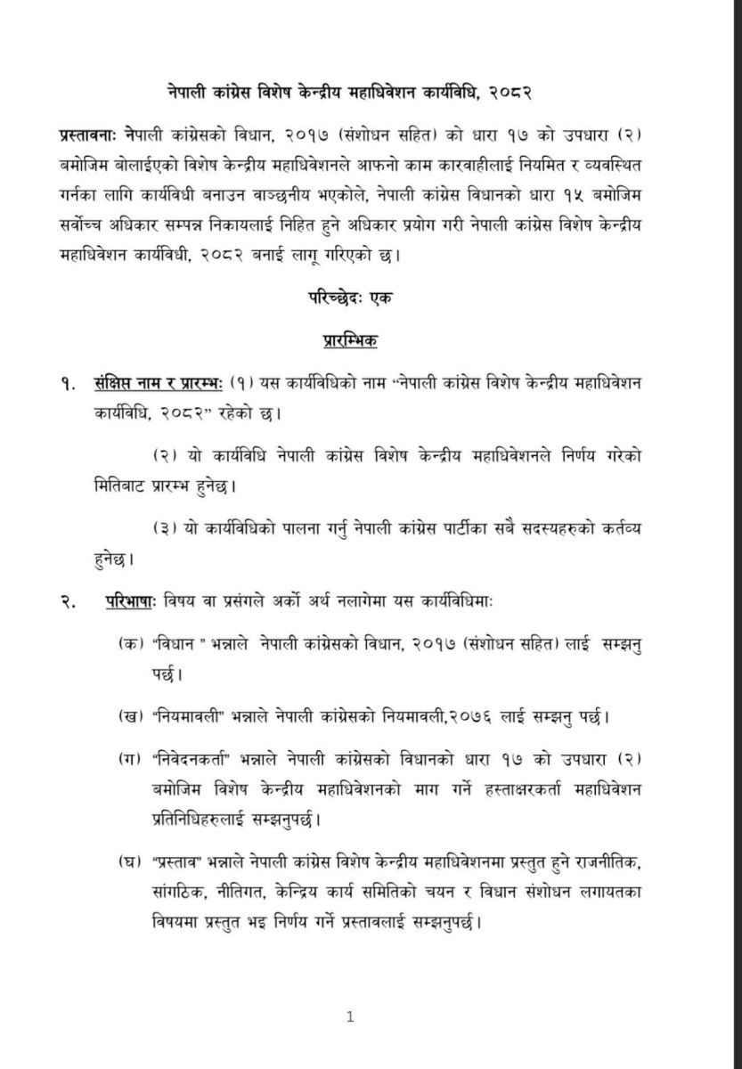 प्रस्तावना भनिएको छ, 'नेपाली कांग्रेसको विधान, २०१७ (संशोधन सहित) को धारा १७ को उपधारा (२) बमोजिम बोलाइएको विशेष केन्द्रीय महाधिवेशनले आफ्नो कामकारबाहीलाई नियमित र व्यवस्थित गर्नका लागि कार्यविधि बनाउन वाञ्छनीय भएकोले, नेपाली कांग्रेस विधानको धारा १५ बमोजिम सर्वोच्च अधिकार सम्पन्न निकायलाई निहित हुने अधिकार प्रयोग गरी नेपाली कांग्रेस विशेष केन्द्रीय महाधिवेशन कार्यविधि, २०८२ बनाइ लागू गरिएको छ।'