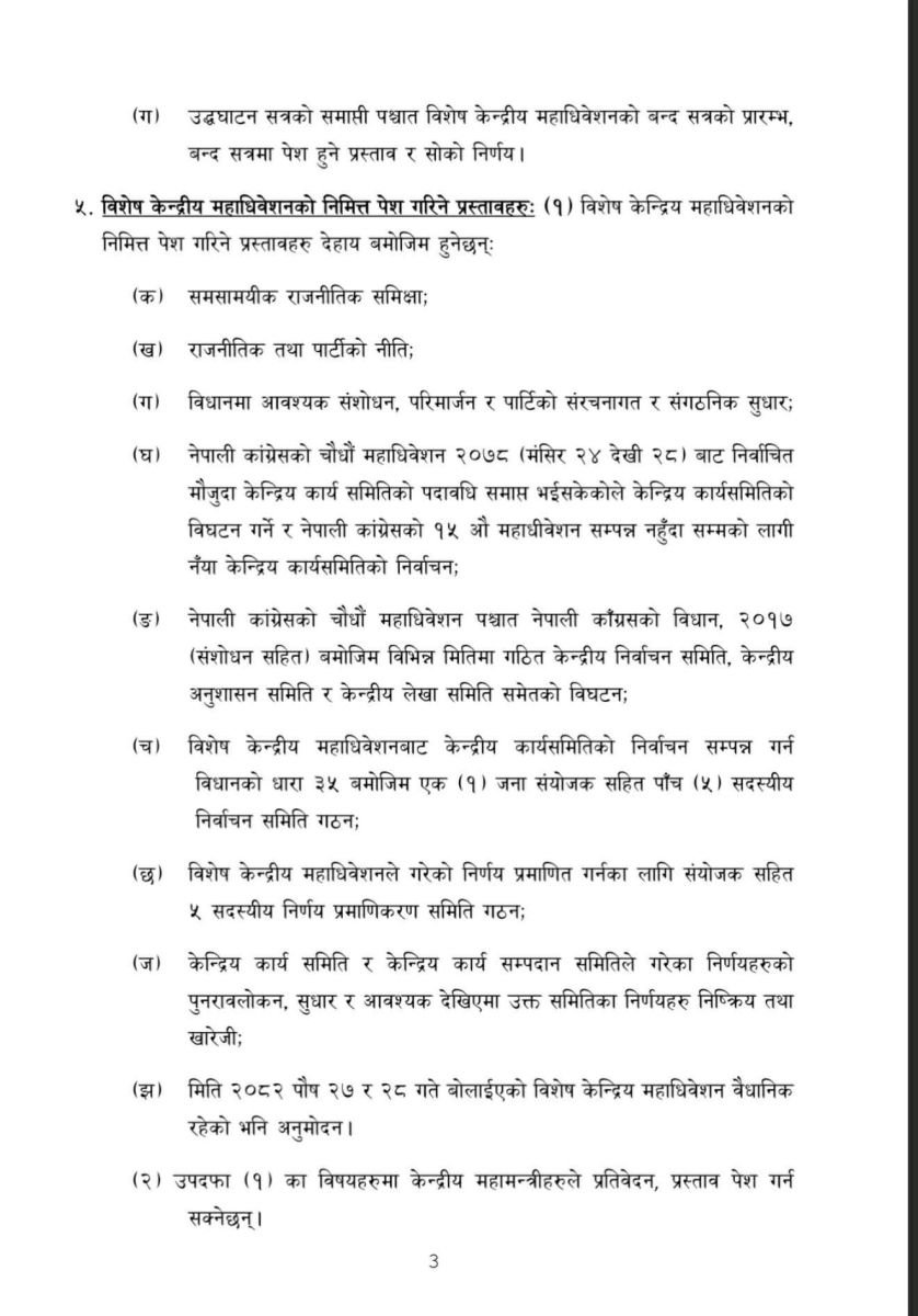 कांग्रेस विशेष महाधिवेशनको बन्दसत्रमा वर्तमान केन्द्रीय समिति विघटन गर्ने र १५औं महाधिवेशन नभएसम्म नयाँ कार्यसमिति गठन गर्ने प्रस्ताव पेस भएको छ।