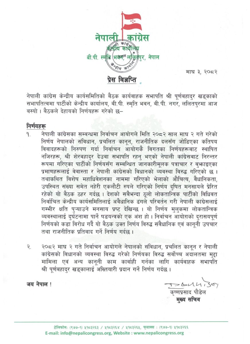 नेपाली कांग्रेस (देउवा पक्ष) ले निर्वाचन आयोगले गरेको निर्णय मुलुकको लोकतान्त्रिक व्यवस्थालाई दुर्घटनामा पार्ने षड्यन्त्र भएको बताएको छ।