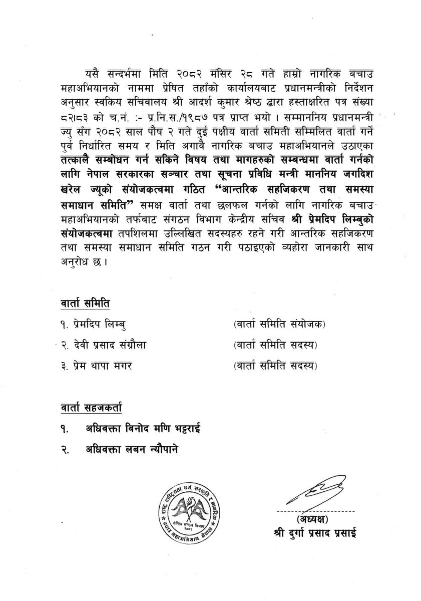 दुर्गा प्रसाईं नेतृत्वको उक्त अभियानले प्रेमदिप लिम्बू संयोजक रहेको वार्ता समिति बनाएको हो । समितिमा देवीप्रसाद संग्रौला र प्रेम थापा मगर सदस्य छन् ।