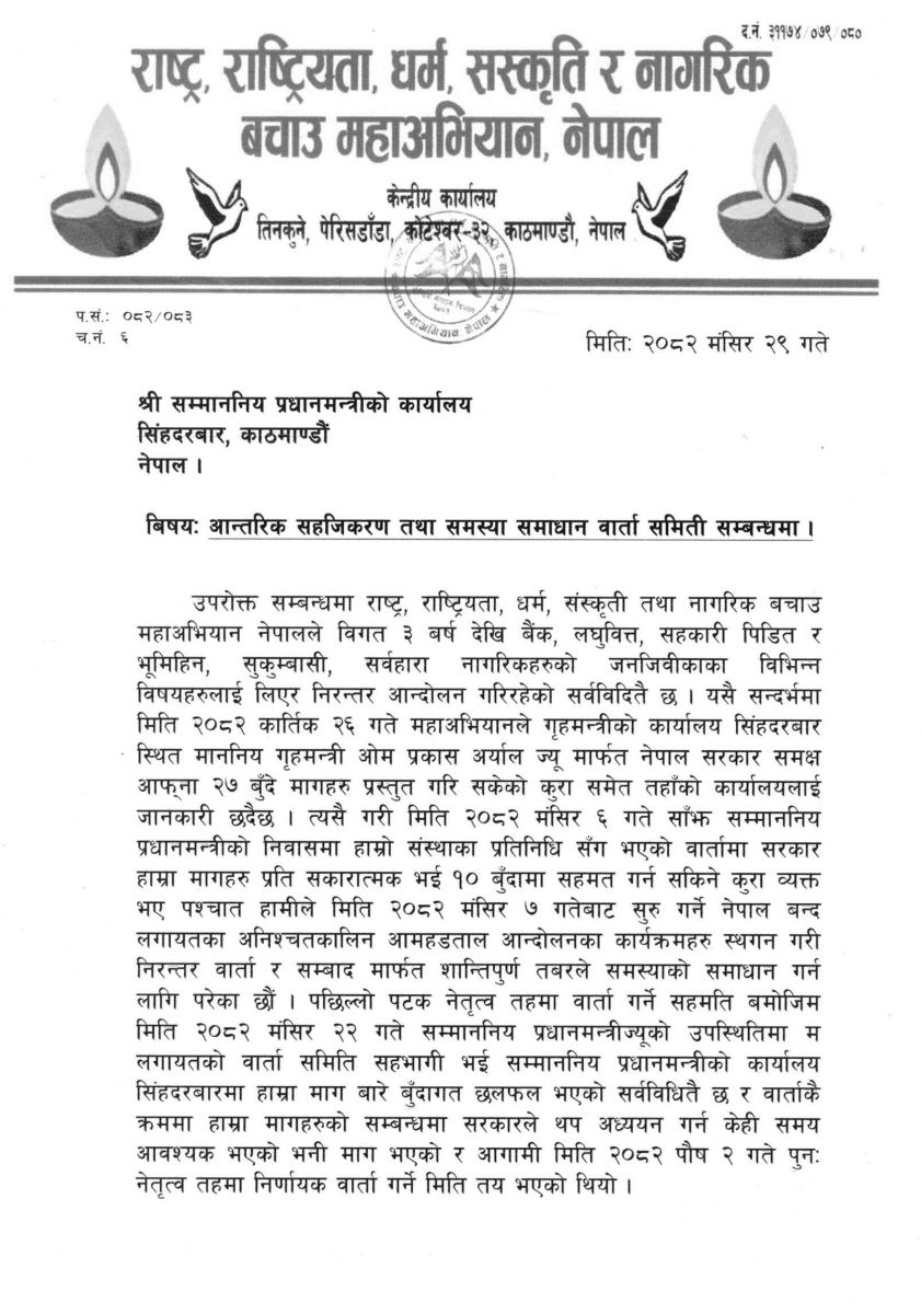 राष्ट्र, राष्ट्रियता, धर्म, संस्कृति र नागरिक बचाउ महाअभियान, नेपालले सरकारसँग वार्ता गर्न तीन सदस्य समिति गठन गरेको छ।