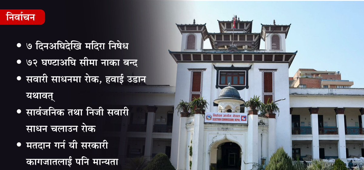 आयोगले निर्वाचनको ७ दिनअघिदेखि मदिरा बिक्री-वितरणमा पूर्ण रोक लगाउनेदेखि ७२ घण्टाअघि अन्तर्राष्ट्रिय सीमा नाका बन्द गर्नेसम्मका निर्णय गर्दै कार्यान्वयनका लागि गृह मन्त्रालयलाई निर्देशन दिएको छ।