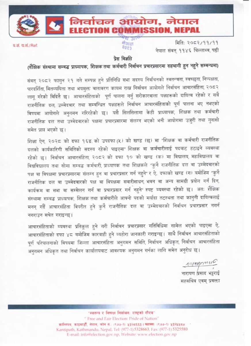 आयोगले शैक्षिक संस्थामा कार्यरत प्राध्यापक, शिक्षक तथा कर्मचारीलाई आफ्नो पदको मर्यादा, तटस्थता र कानुनी दायित्वलाई ध्यानमा राख्दै आचारसंहिता विपरीत कुनै पनि चुनावी गतिविधिमा संलग्न नहुन सचेत गराएको छ।