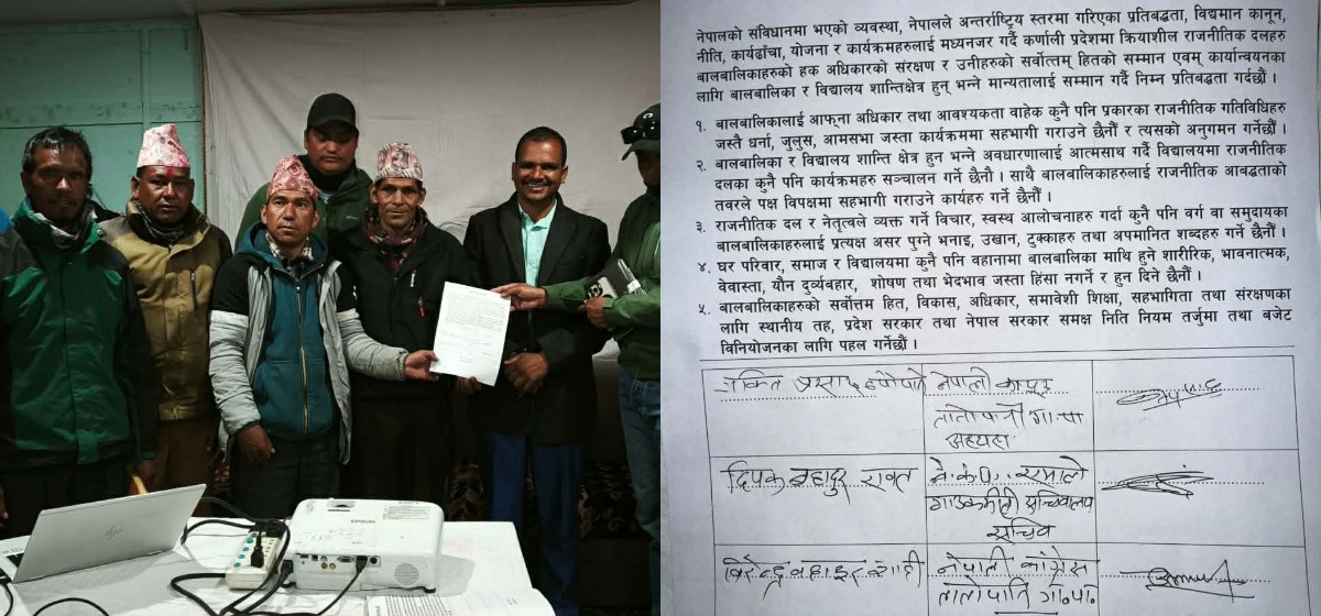 शिक्षा पत्रकार समूह कर्णाली प्रदेशको आयोजनामा सम्पन्न कार्यक्रममा नेपाली कांग्रेस, नेकपा एमाले र नेपाल कम्युनिष्ट पार्टीसहितका राजनीतिक दलहरूले प्रतिबद्धतापत्रमा हस्ताक्षर गरेका छन्। प्रतिबद्धतामा राजनीतिक गतिविधिका नाममा बालबालिकालाई संगठित गर्ने, हडताल, बन्द, चक्काजाम, धर्ना तथा जुलुसमा प्रयोग गर्ने, साथै कुनै दल वा उम्मेदवारको पक्षमा प्रचार–प्रसार गराउन लगाउने कार्य नगर्ने स्पष्ट उल्लेख छ।
