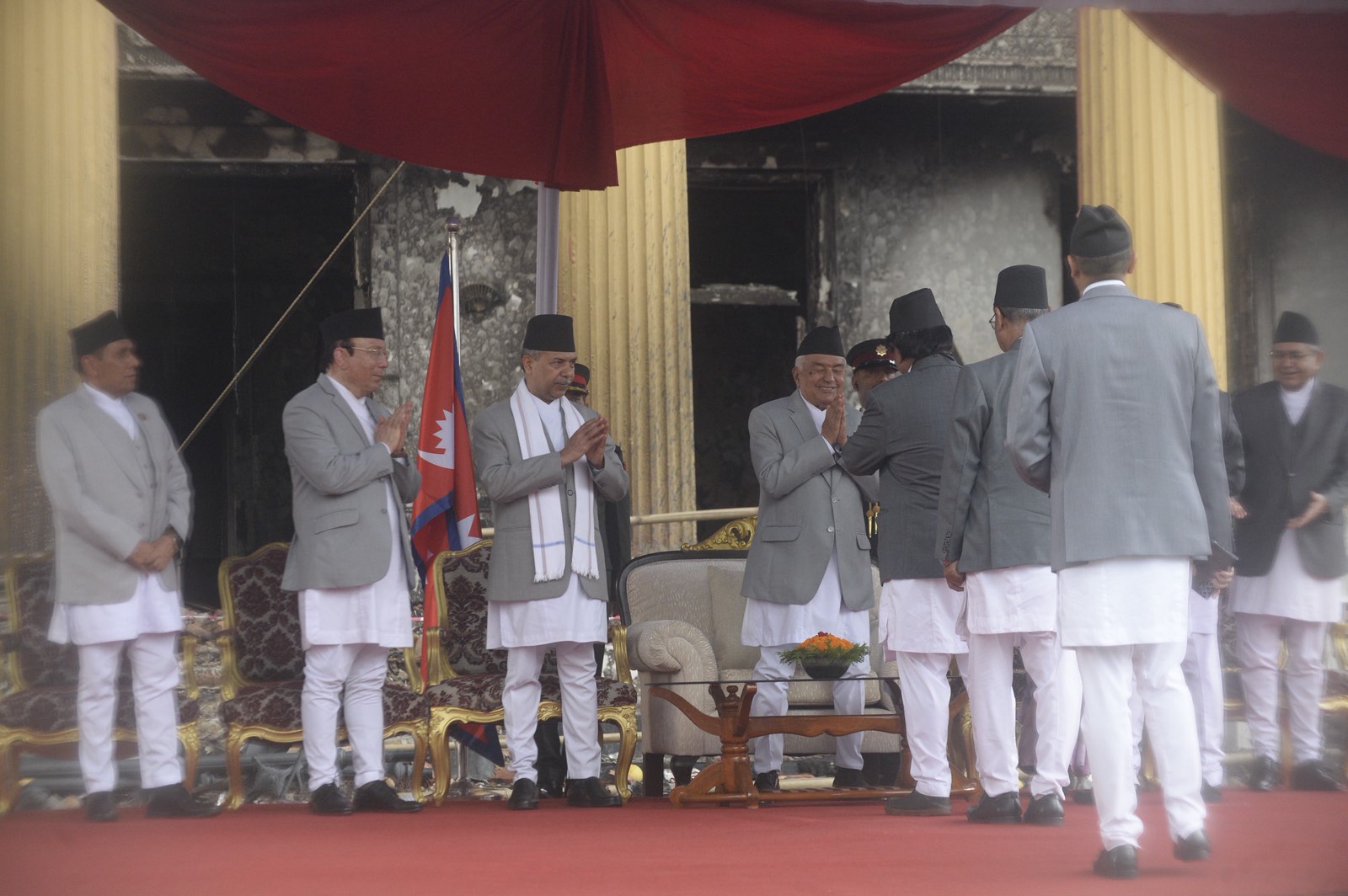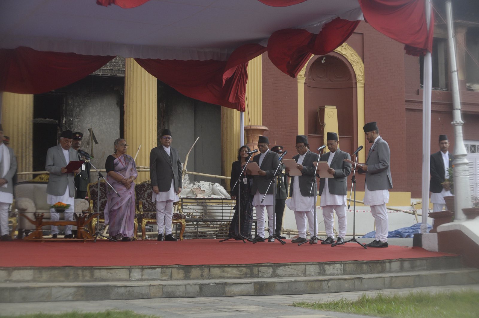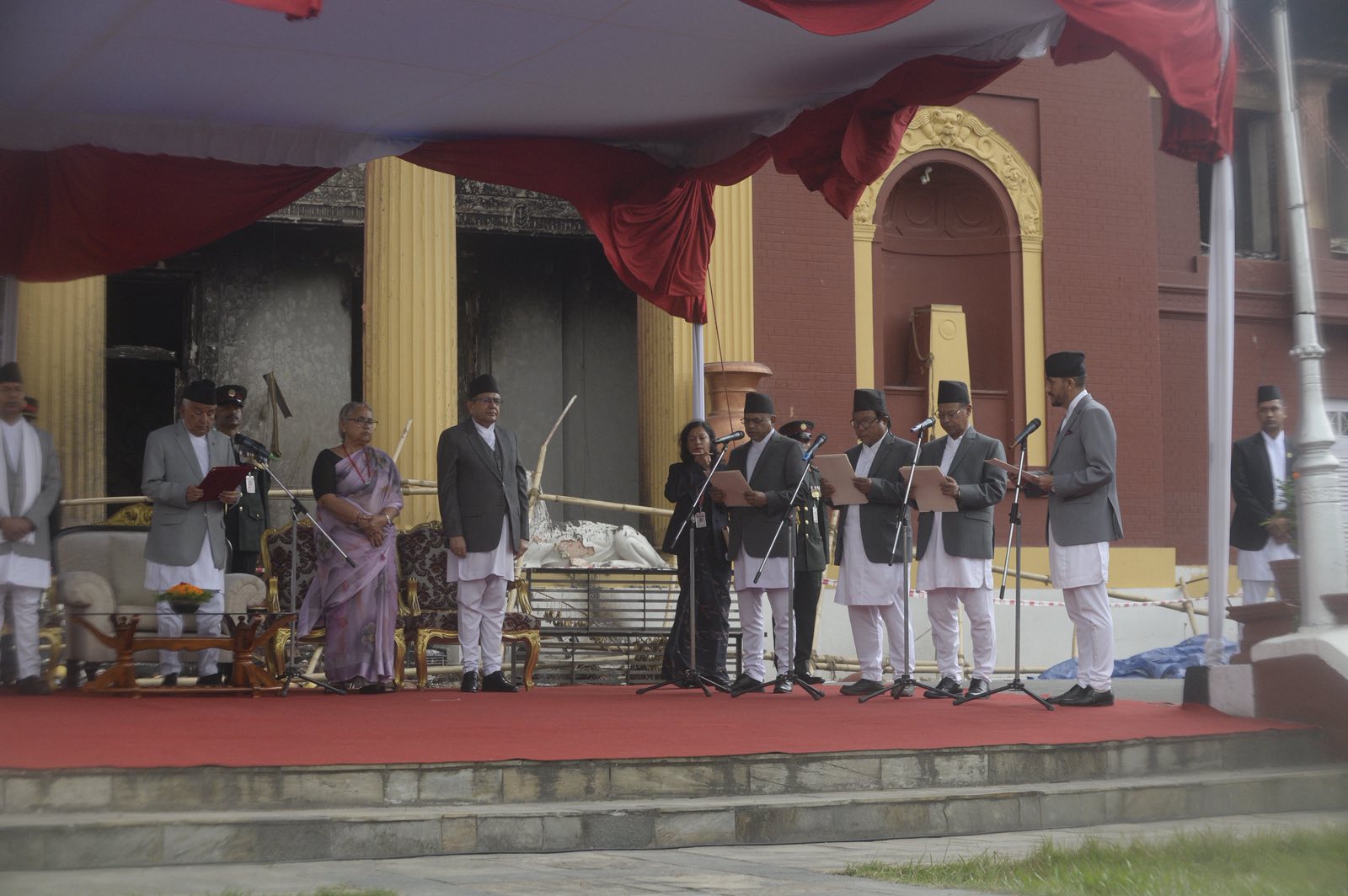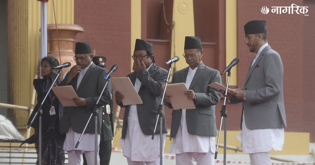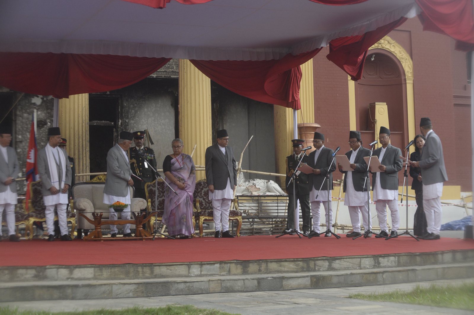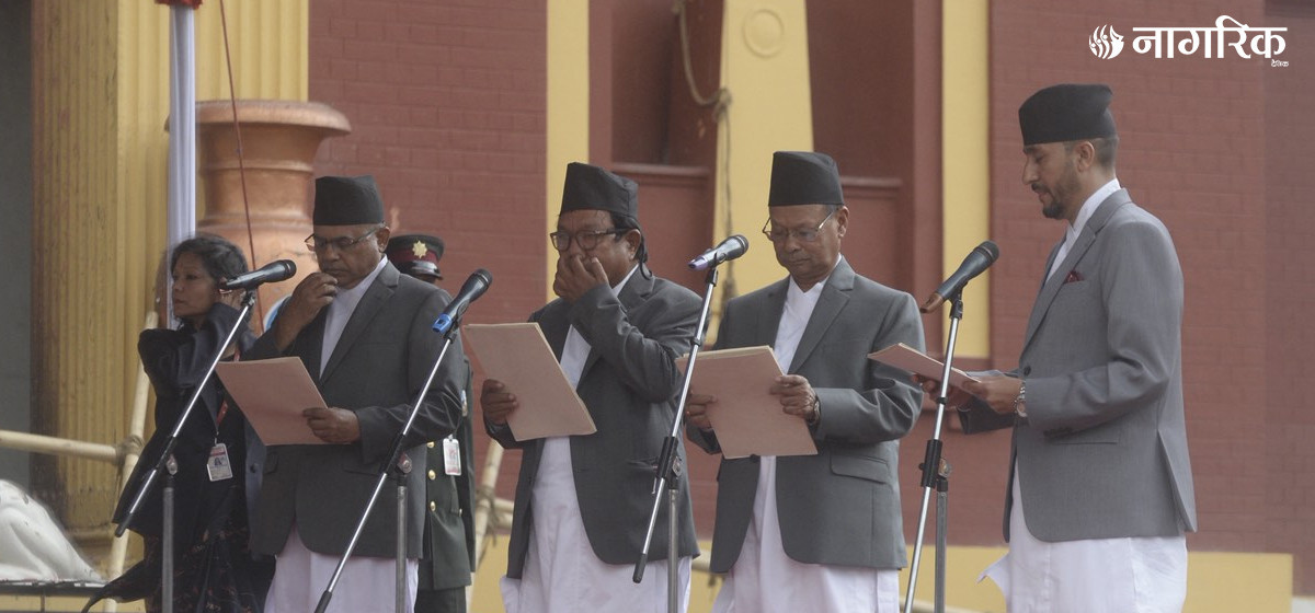 नवनियुक्त चार मन्त्रीले शपथग्रहण गरेका छन्। राष्ट्रपति निवास शितलनिवासमा आयोजित विशेष समारोहमा राष्ट्रपति रामचन्द्र पौडेलले शपथ ग्रहण गराएका हुन्।