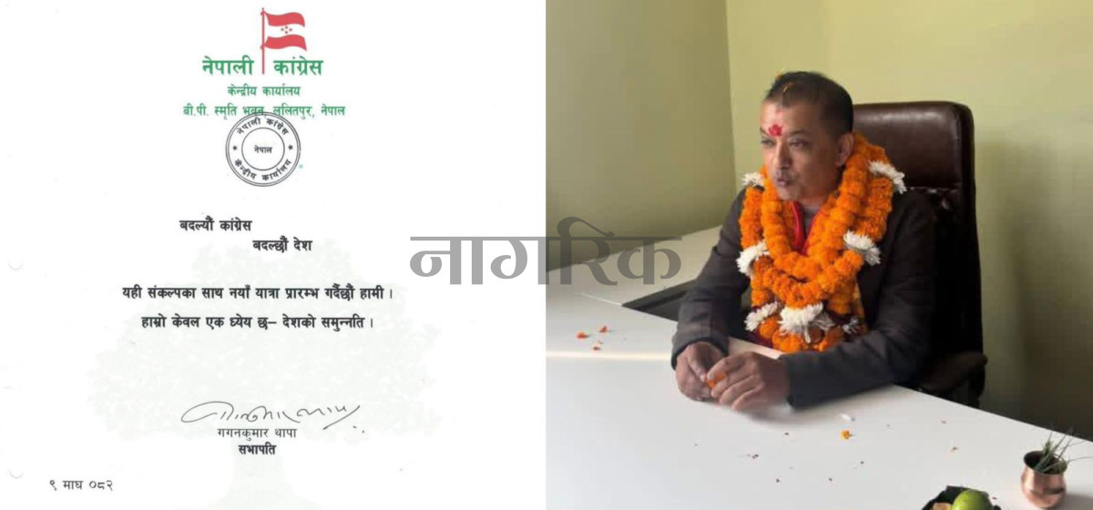 ललितपुरको सानेपास्थित पार्टी मुख्यालयमा शुक्रबार कार्यभार सम्हाल्दै नवनियुक्त सभापति थापाले देश र पार्टी एकसाथ बदल्ने संकल्प पत्रमा हस्ताक्षर गरेका हुन् । सभापति थापाको प्रतिबद्धता पत्रमा भनिएको छ, 'बदल्यौं कांग्रेस, बदल्छौं देश ।'