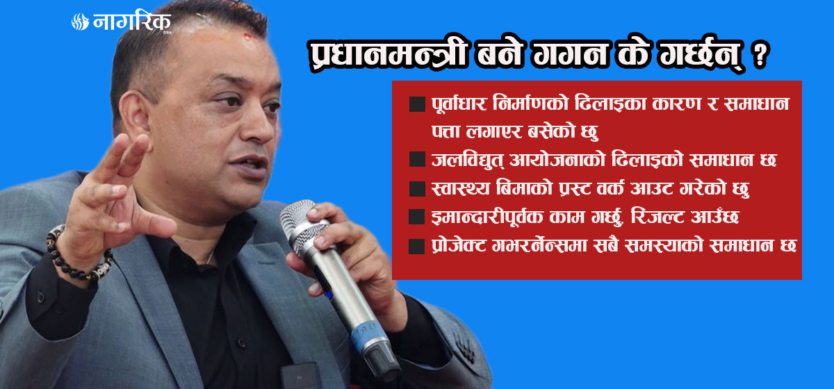 नेपाली कांग्रेसका महामन्त्री गगनकुमार थापाले ‘प्रोजेक्ट गभरनेन्स’मार्फत नेपालका सबै खाले समस्याको समाधानका उपाय खोजेर बसेको दाबी गरेका छन्। आइतबार काठमाडौंमा आयोजित ‘युवासँग जनप्रतिनिधि, युवा र गगन’ नामक कार्यक्रममा बोल्दै महामन्त्री थापाले आफू प्रधानमन्त्री बनेको पहिलो दिनबाटै ती काम गर्ने बताएका हुन्।