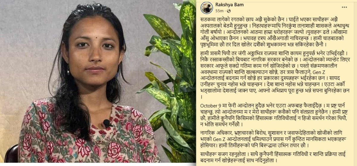 ‘अक्टोबर ९ मा फेरी आन्दोलन हुँदैछ भनेर एउटा अफवाह फैलाइदैछ,’ अभियन्ता बमले लेखेकी छन्, ‘म प्रस्ट पार्न चाहन्छु, त्यो आन्दोलनमा म र मेरो साथीहरू कसैको पनि संलग्नता हुनेछैन।’