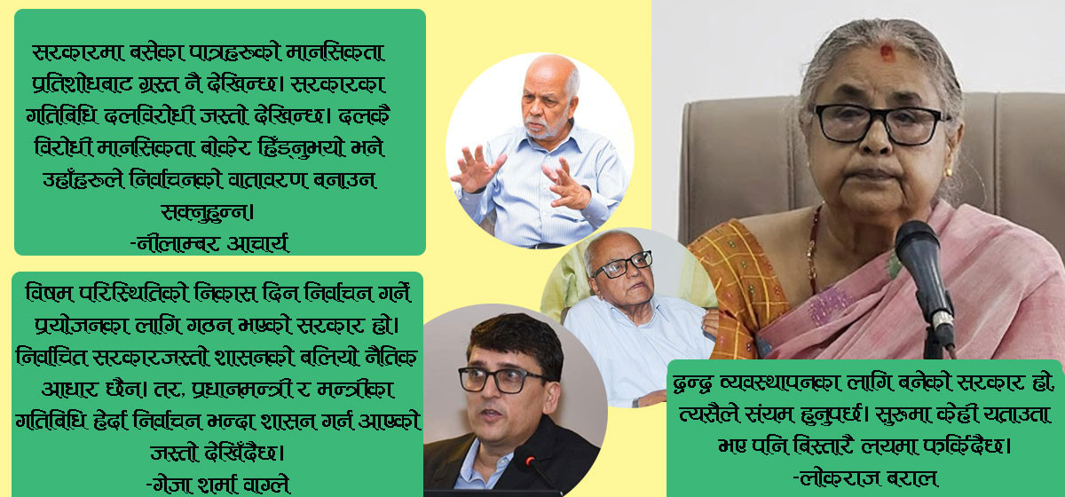 ‘यो विषम परिस्थितिको निकास दिन निर्वाचन गर्ने प्रयोजनका लागि गठन भएको सरकार हो। निर्वाचित सरकारजस्तो शासनको बलियो नैतिक आधार छैन,’ उनले भने, ‘तर, प्रधानमन्त्री र मन्त्रीका गतिबिधि हेर्दा निर्वाचन भन्दा शासन गर्न आएको जस्तो देखिँदैछ।’