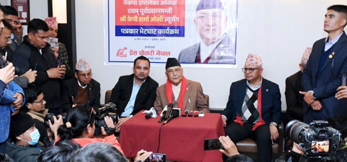 देशलाई चाहिएको शान्ति सुरक्षामा सरकार उदासीन देखिएको औंल्याउँदै ओलीले भने, ‘स्वयं तपाईं पत्रकारहरू नै सेल्फ सेन्सरसिप गर्नुपरेको छ। कसको पक्षमा लेखिदिने भन्ने छ। देशका प्रधानन्यायाधीशले समेत धम्की आएको छ भन्ने अवस्था छ। निर्वाचन आयोग त्रासदीमा छ। प्रहरीको मनोबल छैन। जनताले प्रहरीको बस्ने ठाउँ बनाइदिएका छन्। जेल फोड्ने, क्रिमिनल काम गर्नेहरूको मुद्दा फिर्ता लिने काम भएको छ। यस्तो स्थितिमा शान्ति सुरक्षाको अवस्था नाजुक छ।’