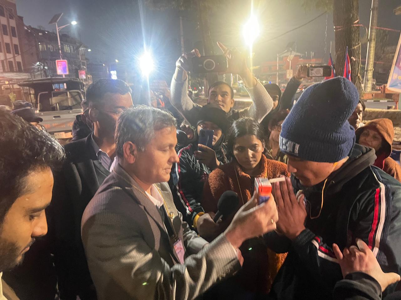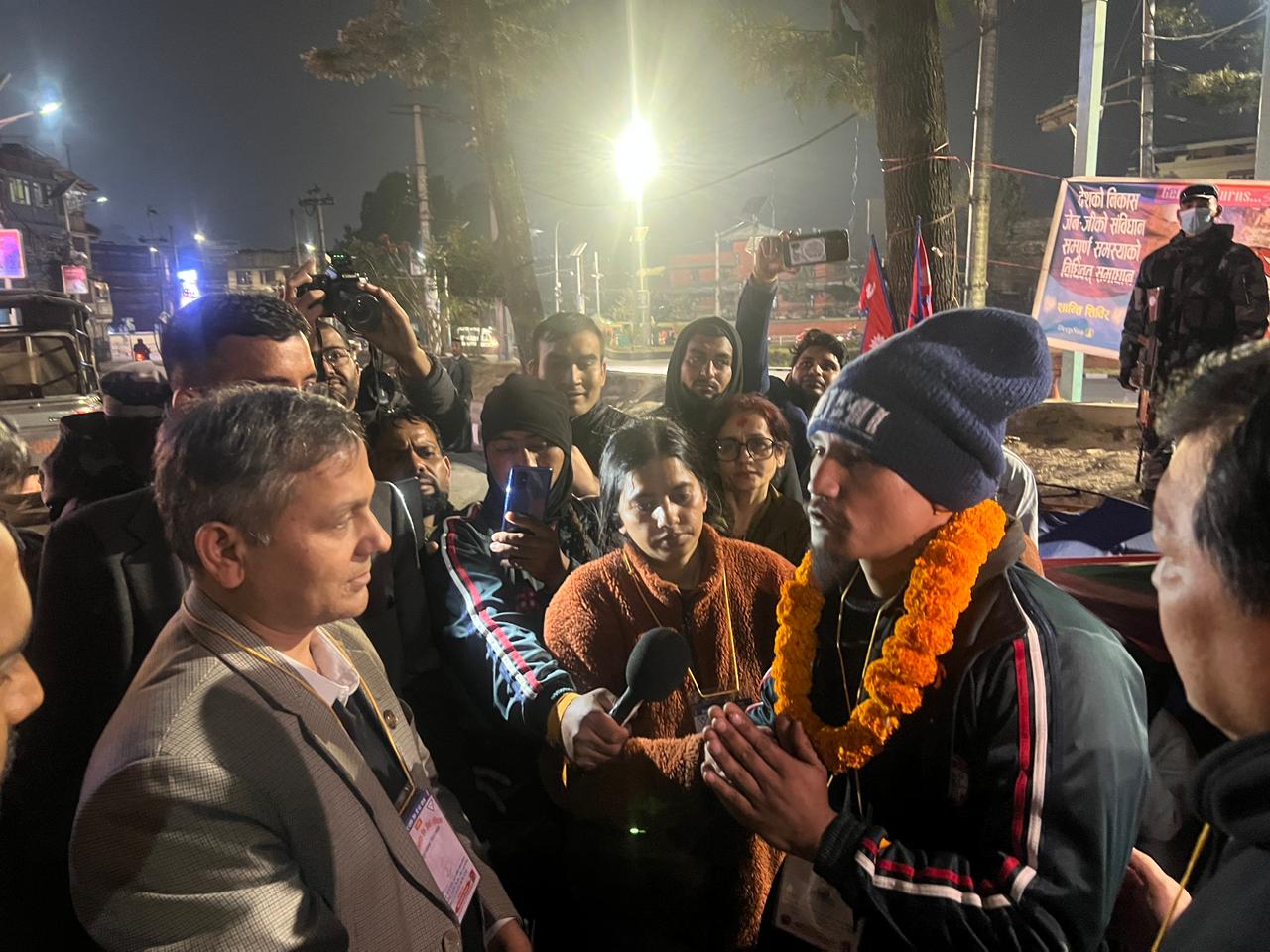 माइतीघर मण्डलामा विभिन्न माग राखी विजय अधिकारीको संयोजकत्वमा पाँच दिनदेखि अनशनरत लोकराज उपाध्याय, स्मृति राई र अशोक घोरासैनीलाई आज साँझ जुस पिलाएर गृहमन्त्री अर्यालले अनशन तोडाएका हुन्।