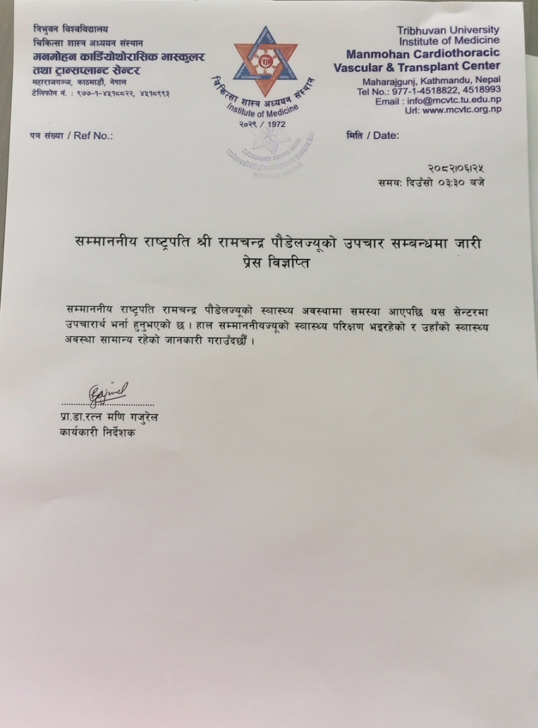 महाराजगञ्जस्थित मनमोहन कार्डियोथोरासिक भास्कुलर तथा ट्रान्सप्लान्ट सेन्टरले शनिबार एक विज्ञप्ति जारी गर्दै राष्ट्रपतिको स्वास्थ्य अवस्था सामान्य रहेको जानकारी दिएको हो।