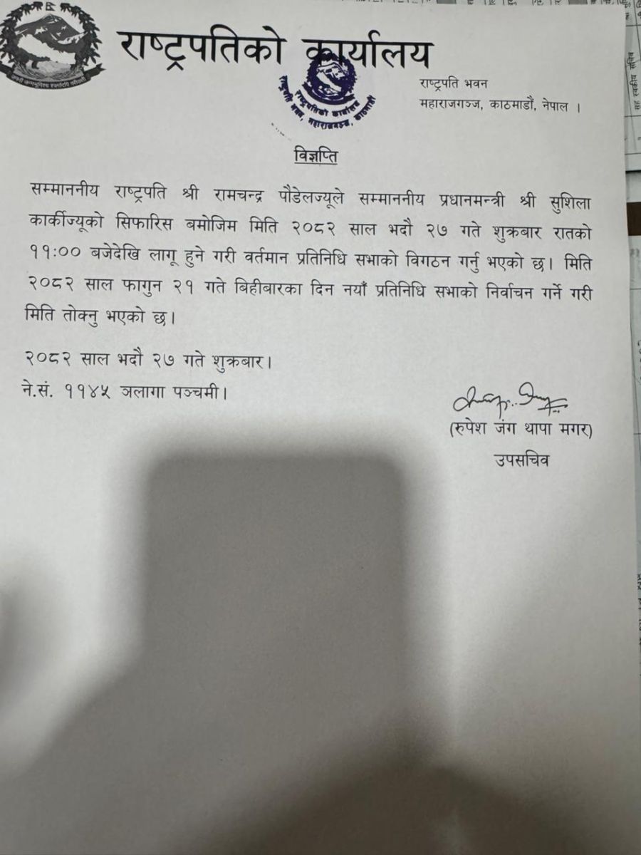 राष्ट्रपति कार्यालयका उपसचिव रुपेश जंगा थापा मगरद्वारा हस्ताक्षरित विज्ञप्तिमा भनिएको छ, ‘सम्माननीय राष्ट्रपति श्री रामचन्द्र पौडेलज्यूले सम्माननीय प्रधानमन्त्री श्री सुशिला कार्कीज्यूको सिफारिस बमोजिम मिति २०८२ साल भदौ २७ गते शुक्रबार रातको ११:०० बजेदेखि लागू हुने गरी वर्तमान प्रतिनिधि सभाको विघटन गर्नु भएको छ।’