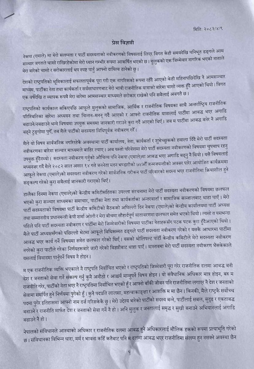 'नेपालको संविधानले आस्थाको अधिकार र राजनीतिक दलमा आबद्ध हुने अधिकारलाई मौलिक हकको रूपमा प्रत्याभूति गरेको छ। संविधानका विभिन्न धारा, मर्म र भावना कहीँ कतैबाट म दलमा आबद्ध भएर राजनीतिमा संलग्न हुन नसक्ने अवस्था छैन,' उनले भनेकी छन्।