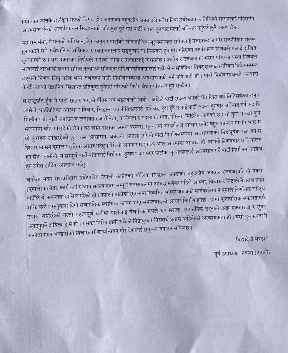 उनले यो घामजस्तै छर्लङ्गै कुरा भएको पनि उनले बताएकी छन्। उनले आफूलाई जनताको बहुदलीय जनवादको सिद्धान्तको प्रतिकूल नै आफूलाई पार्टी सदस्यबाट वञ्चित गर्न खोजिएको बताएकी छन्। 'जनताको बुहदलीय जनवादले संवैधानिक सर्वोच्चता र विधिको शासनलाई गहिरोसँग आत्मसात् गरेको सन्दर्भमा यस सिद्धान्तको प्रतिकूल हुनेगरी पार्टी सदस्य हुनबाट मलाई वञ्चित गर्नुपर्ने कुनै कारण छैन,' उनले भनेकी छन्।