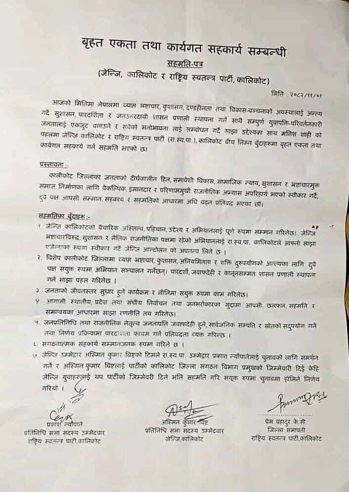 ७. जेनजी उम्मेदवार अस्मिन कुमार विष्टको टिमले रास्वपा उम्मेदवार प्रकाश न्यौपानेलाई चुनावको लागि समर्थन गर्ने र अस्मिन कुमार विष्टलाई पार्टीको कालिकोट जिल्ला संगठन विभाग प्रमुखको जिम्मेवारी दिई केही जेनजी युवाहरुलाई थप पार्टीको जिम्मेवारी दिने भनी सहमति गरी संयुक्त रुपमा चुनावमा होमिने निर्णय गरियो।