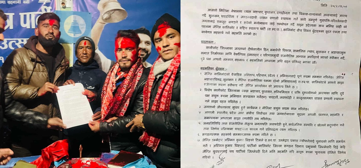 १. जेनजी कालिकोटको वैचारिक अस्तित्व, पहिचान, उद्देश्य र अभियानलाई पूर्ण रुपमा सम्मान गरिनेछ। जेनजी भ्रष्टाचारविरुद्ध, सुशासन र नैतिक राजनीतिका पक्षमा रहेको अभियानलाई रा.स्व.पा. कालिकोटले आफ्नो साझा एजेन्डाका रुपमा स्वीकार गर्दै जेनजी आन्दोलनको अपनत्व लिने छ।