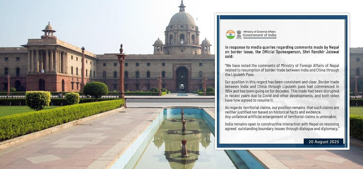 ‘सीमा दाबीहरूको सन्दर्भमा हाम्रो अडान कायम छ कि त्यस्ता दाबीहरू न जायज छन्, न त ऐतिहासिक तथ्य र प्रमाणमा आधारित छन्,’ विज्ञप्तिमा लेखिएको छ, ‘एक पक्षीय कृत्रिम विस्तार असम्भव छ।’ यद्यपि भारत संवाद र कूटनीतिमार्फत बाँकी सीमा मुद्दाहरू समाधान गर्न नेपालसँग रचनात्मक अन्तरक्रियाको लागि खुला रहेको विज्ञप्तिमा लेखिएको छ।