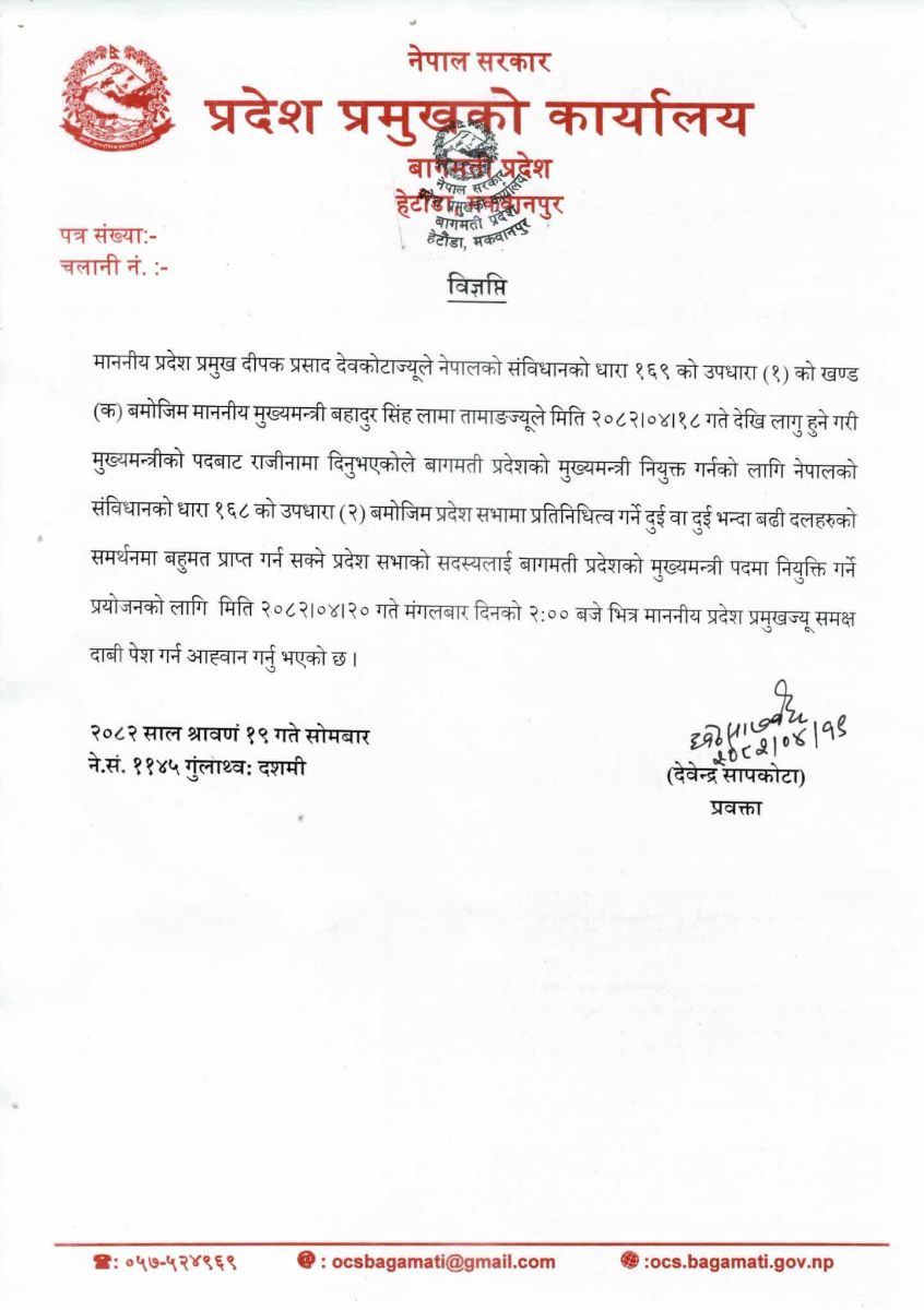 आइतबार बहादुर सिंह लामाले मुख्यमन्त्री पदबाट राजीनामा दिएपछि सोमबार प्रदेश प्रमुख दीपक प्रसाद देवकोटाले नेपालको संविधानको धारा १६८ को उपधारा (२) बमोजिम मुख्यमन्त्रीमा दाबी पेस गर्न आह्वान गरेका छन् ।