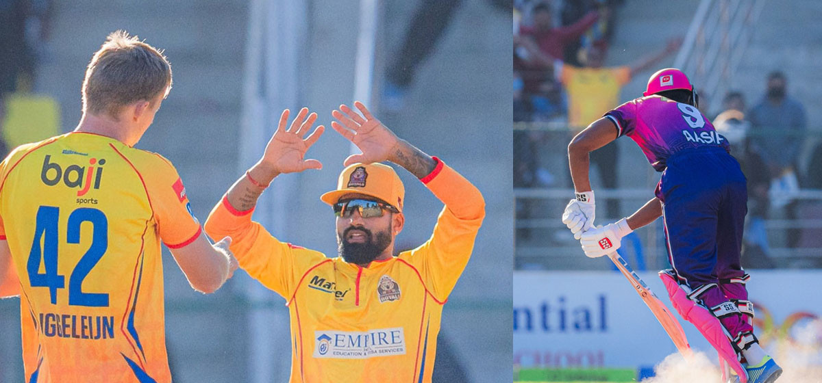 मयन यादवले १० बलको सामना गर्दै १ चौका मद्दतमा ६ रन बनाएर पेभेलियन फर्किए। यसअघि कुगेलेइनले नै ओपनर आसिफ शेखलाई शून्य रनमा बोल्ड गरेका थिए।