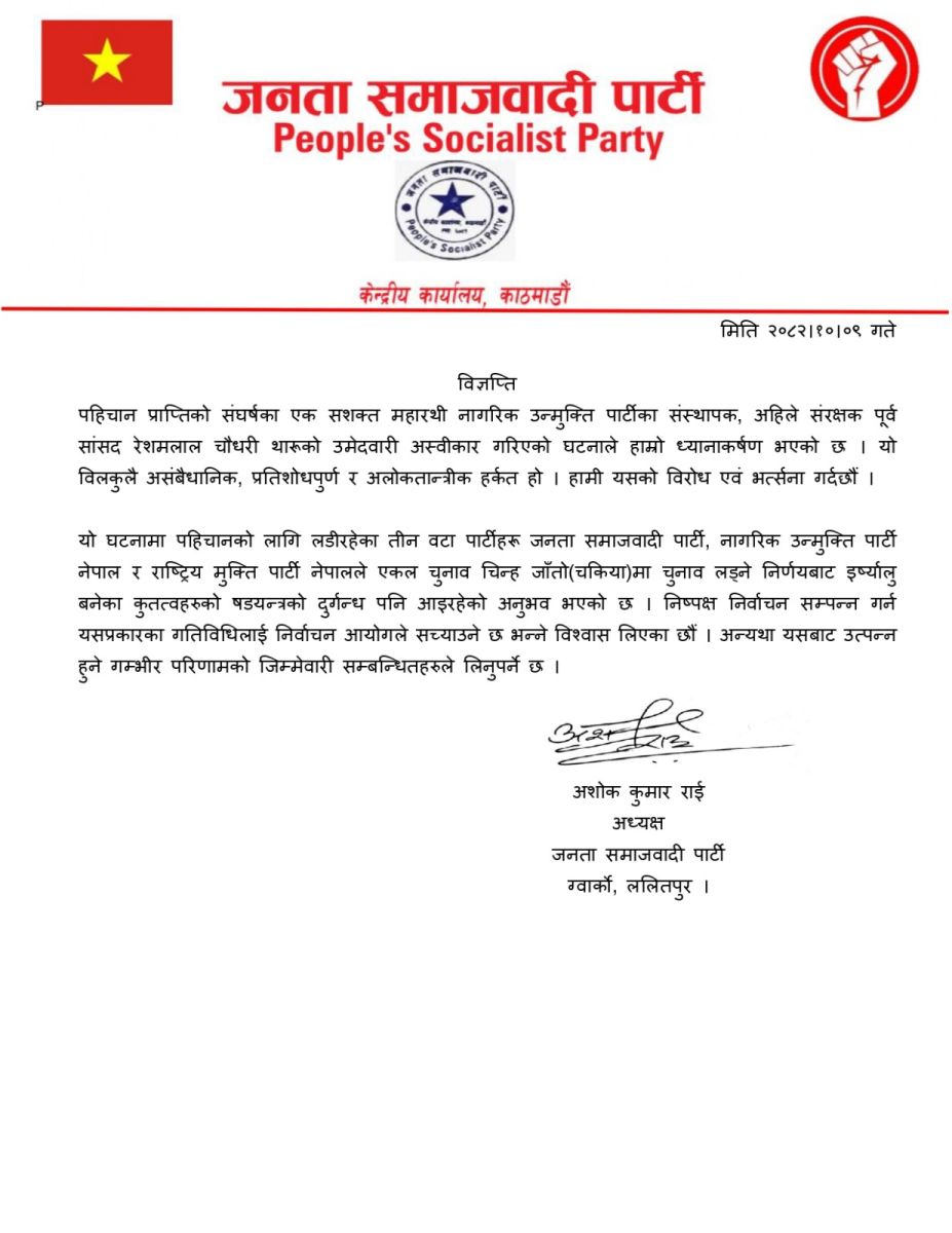 विज्ञप्तिमा पहिचानको आन्दोलनमा सक्रिय जनता समाजवादी पार्टी, नागरिक उन्मुक्ति पार्टी नेपाल र राष्ट्रिय मुक्ति पार्टी नेपालबीच एकल चुनाव चिन्ह ‘जाँतो’ मार्फत चुनाव लड्ने निर्णयबाट ईर्ष्यालु बनेका शक्तिहरूको षड्यन्त्रको आशंका भनिएको छ।
