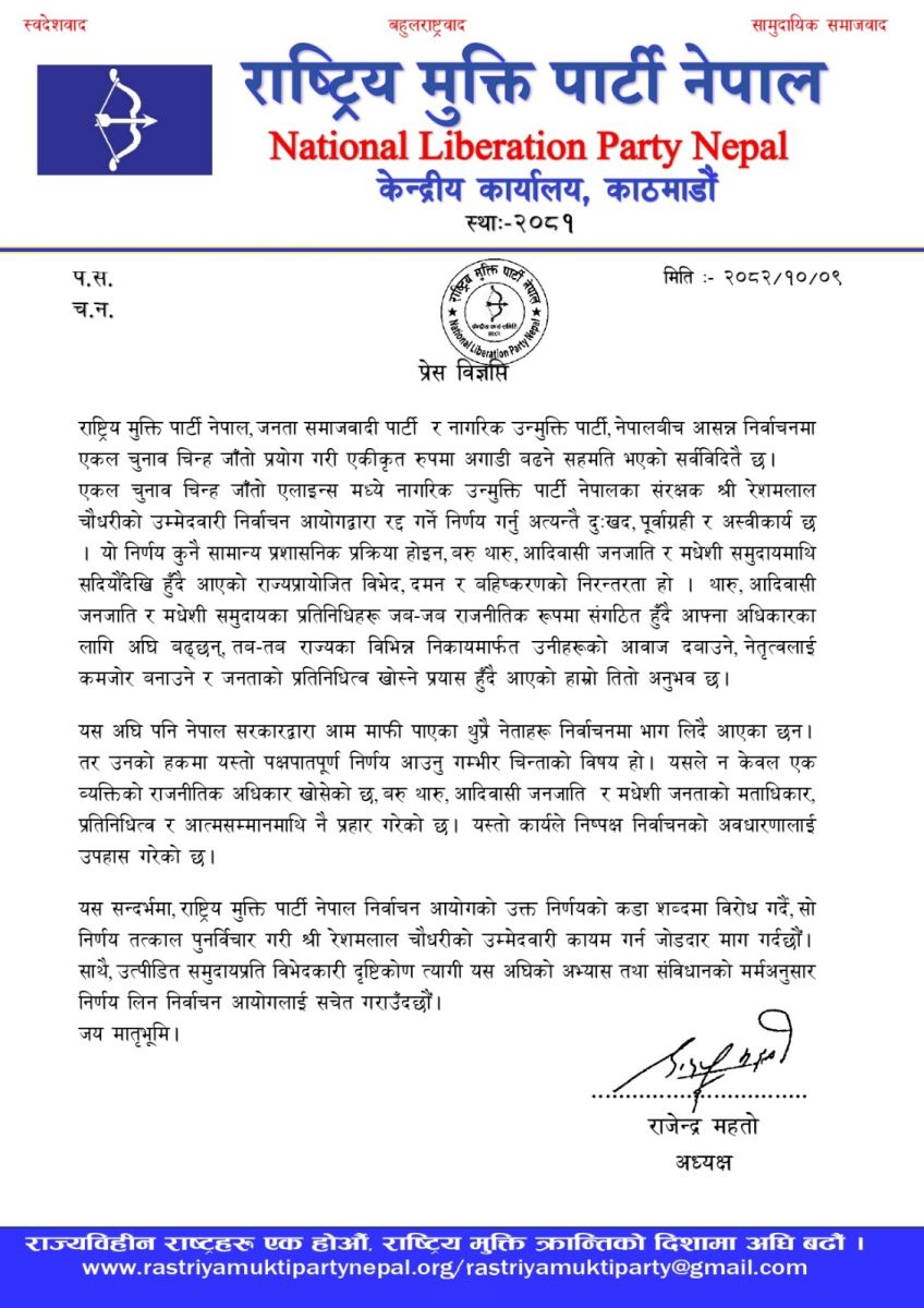 त्यस्तै गरी राष्ट्रिय मुक्ति पार्टी नेपालका अध्यक्ष राजेन्द्र महतोद्वारा जारी विज्ञप्तिमा पनि चौधरीको उम्मेदवारी रद्द गर्ने निर्वाचन आयोगको निर्णय अत्यन्त दुःखद, पूर्वाग्रही र अस्वीकार्य रहेको उल्लेख छ। राष्ट्रिय मुक्ति पार्टीले यसअघि आममाफी पाएका अन्य नेताहरू निर्वाचनमा सहभागी हुँदै आएको उदाहरण प्रस्तुत गर्दै चौधरीको हकमा मात्रै यस्तो निर्णय आउनु गम्भीर पक्षपात भएको जनाएको छ।