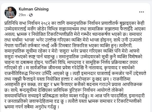रास्वपाका नेता कुलमान घिसिङले समानुपातिक उम्मेदवार सिफारिसमा आफ्ना आफन्त राखेको आरोपलाई खण्डन गरेका छन्। सामाजिक सञ्जालमार्फत जारी गरेको बयानमा कुलमानले यस्ता हल्ला असत्य, भ्रामक र नियोजित भएको दाबी गर्दै आफ्नो इमानदार छविलाई बदनाम गर्ने प्रयासका रूपमा व्याख्या गरेका छन्।