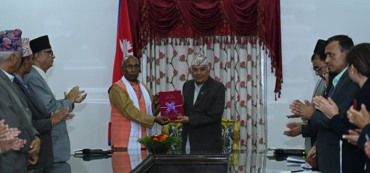 सो क्रममा भाषा आयोगका अध्यक्ष डा.गोपाल ठाकुरले आयोगको प्रतिवेदन राष्ट्रपति समक्ष पेश गरेका थिए ।