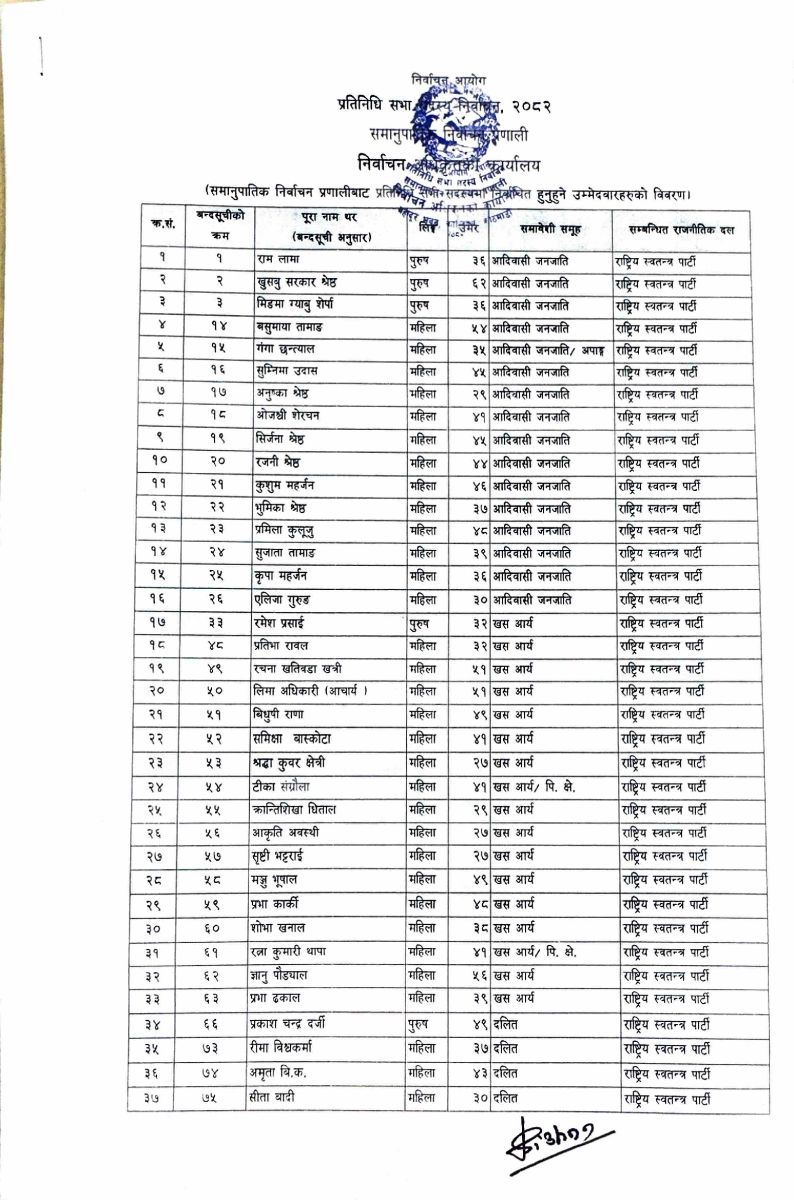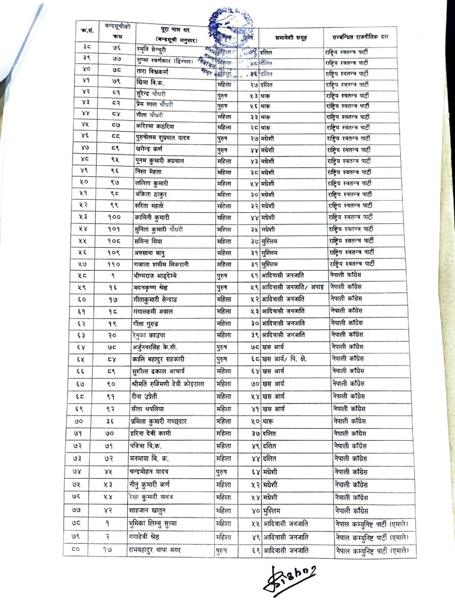 प्रतिनिधि सभाकाे २७५ सिटमध्ये १६५ प्रत्यक्ष र ११० सिट समानुपातिकतर्फ निर्वाचित हुने व्यवस्था छ। सोही अनुसार, आयोगले ११० जनाको नाम सार्वजनिक गरेको हो।