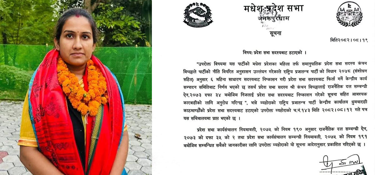 राष्ट्रिय प्रजातन्त्र पार्टी (राप्रपा) मधेस प्रदेश सभाकी सांसद कञ्चन विच्छाको पद खारेज गरिएको छ। मधेस प्रदेश सभाले शुक्रबार विच्छालाई सांसद पदबाट हटाएको सूचना जारी गरेको हो।