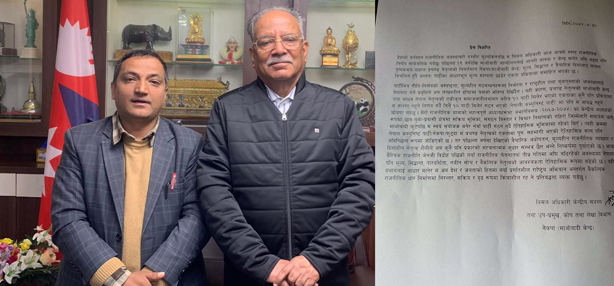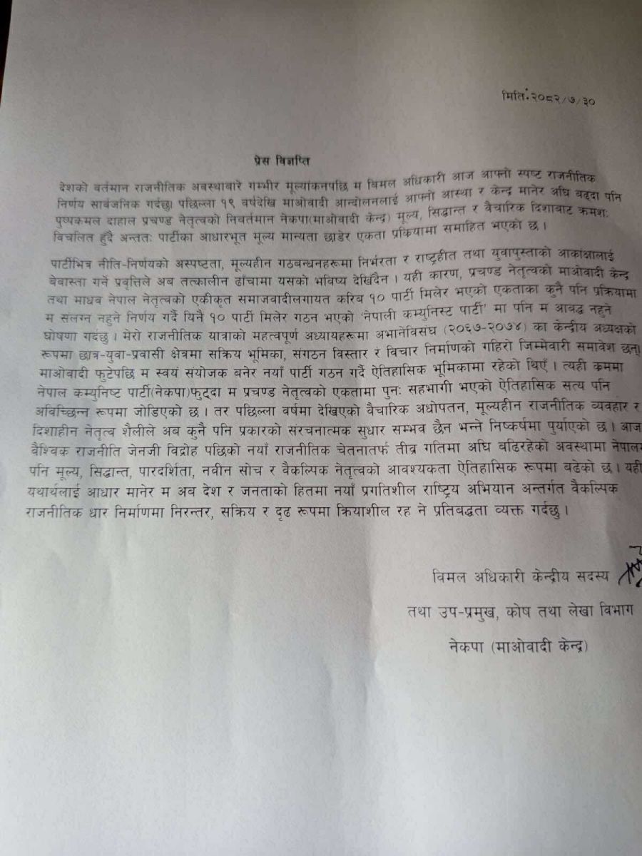 नेकपा (माओवादी केन्द्र)का केन्द्रीय सदस्य तथा कोष तथा लेखा विभागका उप-प्रमुख विमल अधिकारीले पार्टी परित्यागको घोषणा गरेका छन्। आज एक प्रेस विज्ञप्ति जारी गर्दै उनले उक्त घोषणा गरेका हुन्।