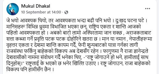 मुकुलले भदौ २४ गते राजा महेन्द्र शाहको कविता सेयर गरेका छन्। त्यसपछि दोस्रो दिन भदौ २५ मा ‘राष्ट्र जोगाउन राजाबाहेकको विकल्प नरहेको’ भन्दै फेसबुकमा स्टाटस लेखेका छन्।