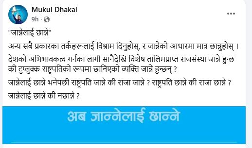 शुक्रबार फेरि रास्वपा ‘जान्नेलाई छान्ने’ नारालाई उल्लेख गरेर ‘राष्ट्रपति भन्दा राजा नै जान्ने’ भन्ने आशय झल्किने अर्को स्टाटस राखेका छन्।