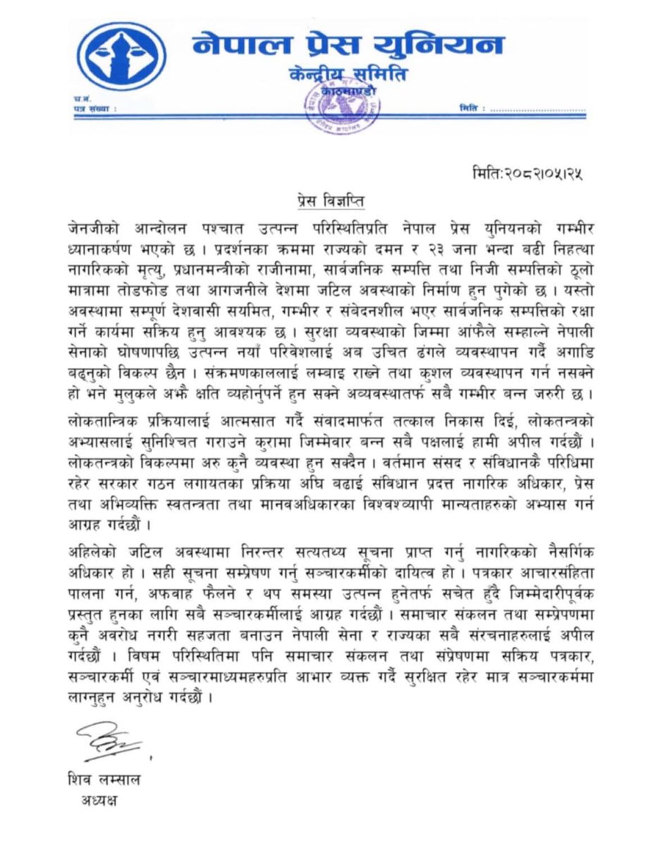 जेनजीको आन्दोलनपछि उत्पन्न जटिल परिस्थितिप्रति गम्भीर चिन्ता व्यक्त गर्दै नेपाल प्रेस युनियनका केन्द्रीय अध्यक्ष शिव लम्सालले जारी गरेको विज्ञप्तिमा आन्दोलनका क्रममा भएको राज्यको दमन, २३ जनाभन्दा बढी निहत्था नागरिकको मृत्यु, प्रधानमन्त्रीको राजीनामा, र सार्वजनिक तथा निजी सम्पत्तिको व्यापक तोडफोडले देश संकटपूर्ण अवस्थामा पुगेको उल्लेख छ। यस्तो अवस्थामा सबै देशवासीलाई संयमित र संवेदनशील भई देशको रक्षा गर्न सक्रिय हुनुपर्नेमा जोड दिइएको छ।