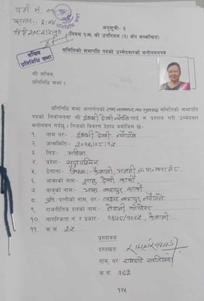 प्रतिनिधि सभाको राज्य व्यवस्था तथा सुशासन समितिको सभापतिमा ईश्वरी देवी न्यौपानेले मनोनयन दर्ता गराएकी छन् ।