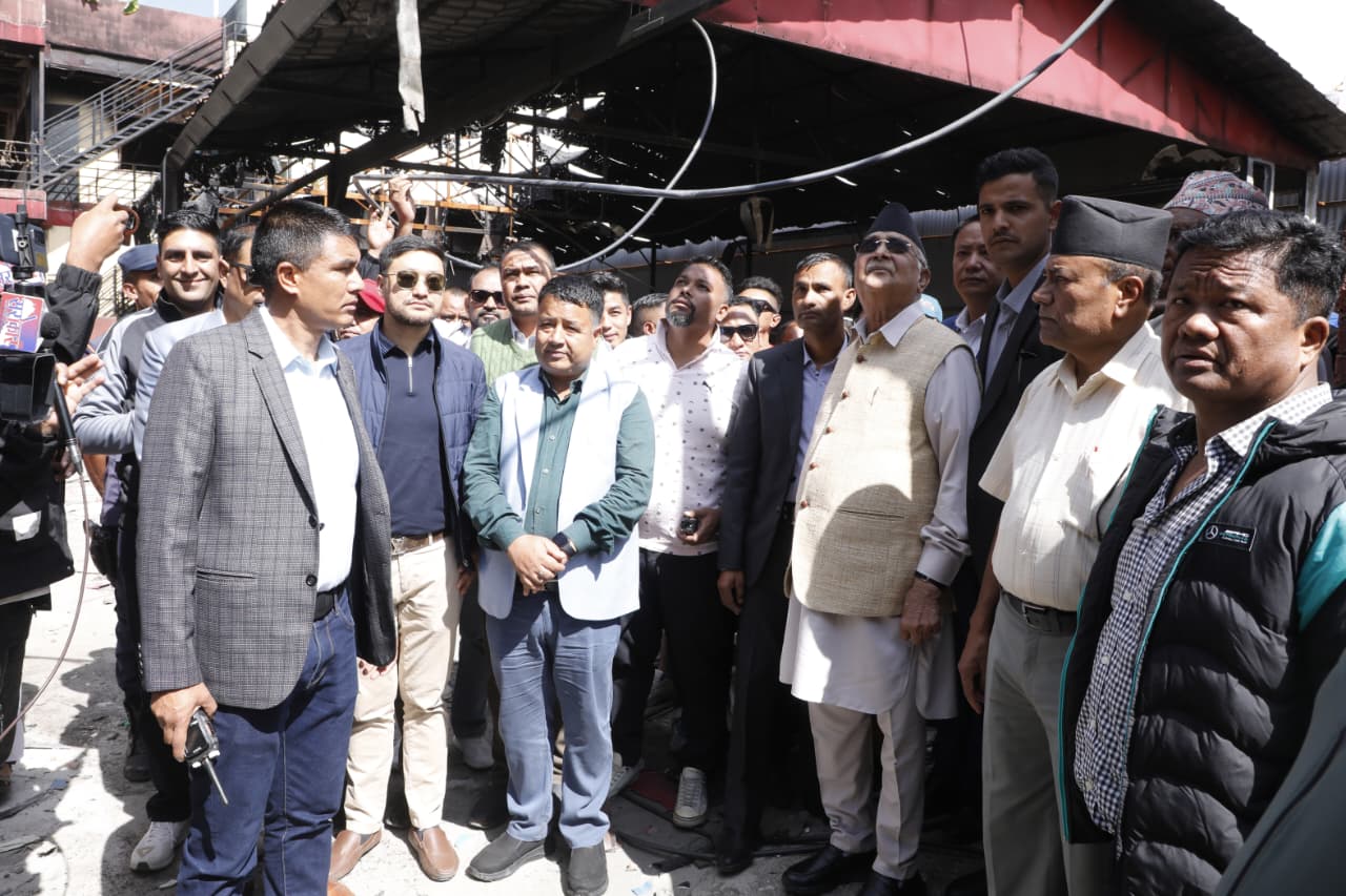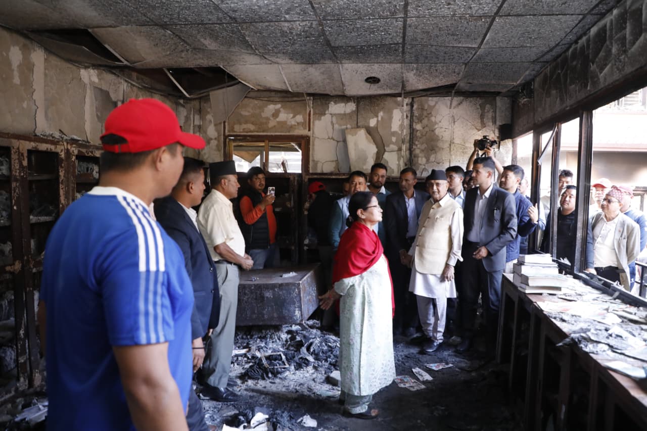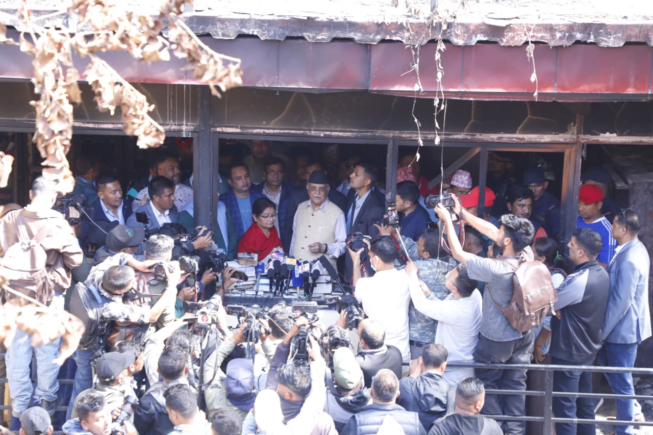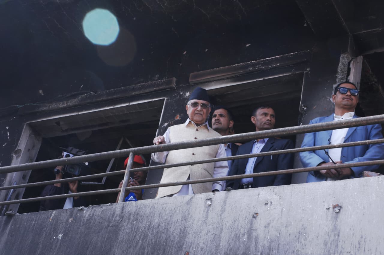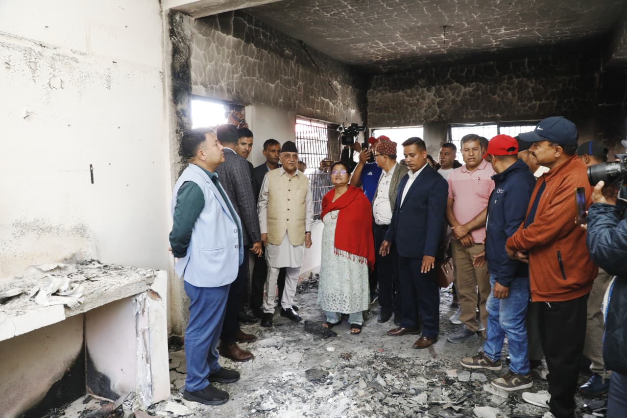पहिले गेटमा पुगेर धेरैबेर वरपरको अवस्था हेरेका ओलीले क्रमश: बार्दली, जलेर क्षतिग्रस्त बनेको भवन, पुस्तकालय निकै बेरलगाएर हेरेका थिए ।