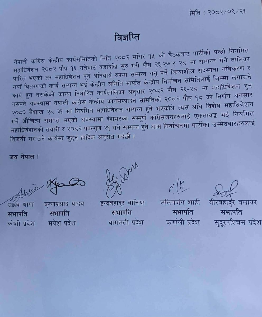 विज्ञप्तिमा उल्लेख भएअनुसार नेपाली कांग्रेस केन्द्रीय कार्यसमितिको २०८२ मङ्सिर १५ गतेको बैठकले पार्टीको पन्ध्रौँ नियमित महाधिवेशन २०८२ पौष १६ गतेबाट वडास्तरदेखि सुरु गरी पौष २६, २७ र २८ गते सम्पन्न गर्ने तालिका पारित गरेको थियो। तर महाधिवेशनअघि अनिवार्य रूपमा सम्पन्न हुनुपर्ने क्रियाशील सदस्यता नवीकरण र नयाँ वितरणको काम समयमै सम्पन्न भई केन्द्रीय निर्वाचन समितिलाई जिम्मा लगाउन नसकिएपछि निर्धारित मितिमा महाधिवेशन हुन नसक्ने अवस्था सिर्जना भएको जनाइएको छ।