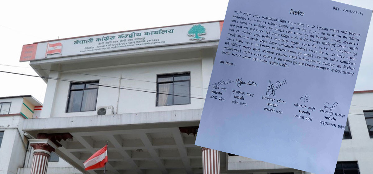 नेपाली कांग्रेसका पाँच प्रदेश सभापतिले विशेष महाधिवेशनको औचित्य समाप्त भइसकेको निष्कर्ष निकाल्दै पार्टीका नेता–कार्यकर्तालाई नियमित महाधिवेशनको तयारी र आसन्न निर्वाचनमा केन्द्रित हुन अपिल गरेका छन्।