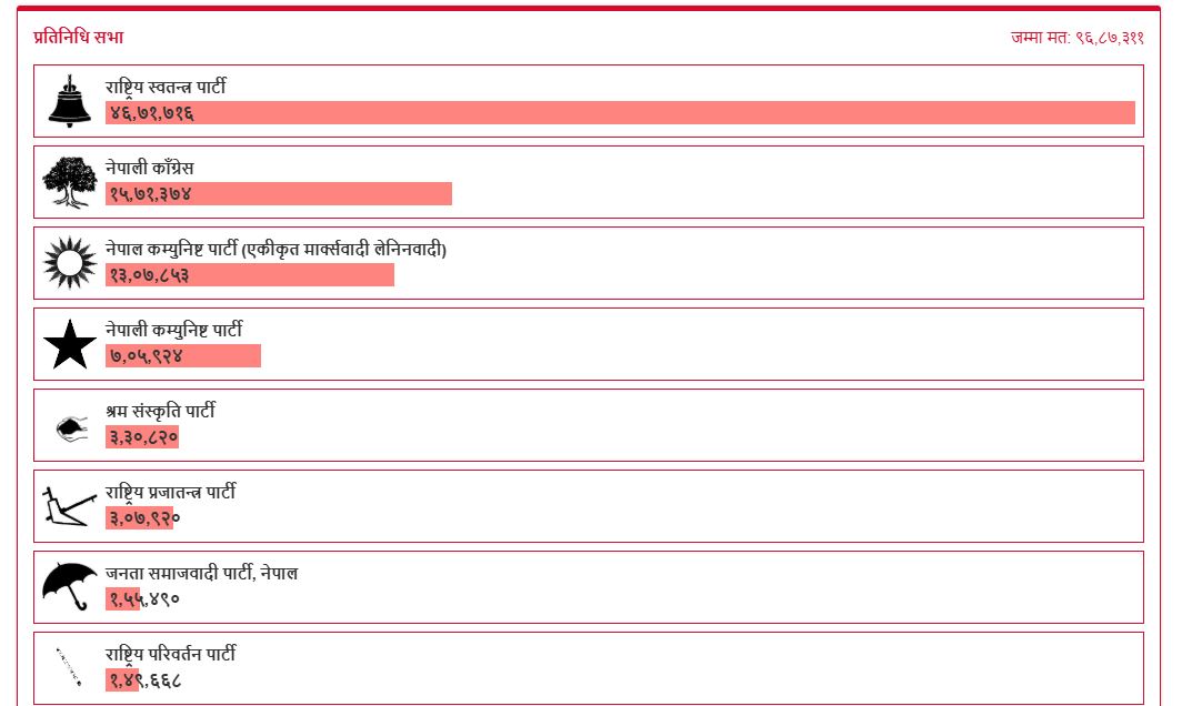 निर्वाचन आयोगले सार्वजनिक गरेको पछिल्लो विवरणअनुसार हालसम्म ५८ लाख ७५ हजार ३ सय ३२ मत गणना भएको छ। यो मतगणनामा राष्ट्रिय स्वतन्त्र पार्टी (रास्वपा) स्पष्ट अग्रस्थानमा देखिएको छ। रास्वपाले ४६ लाख ७१ हजार ७१६ मत प्राप्त गरेको छ।